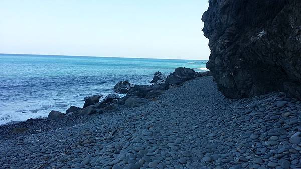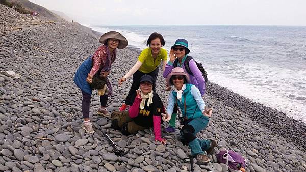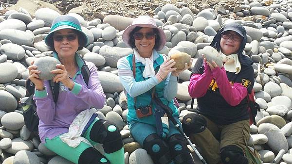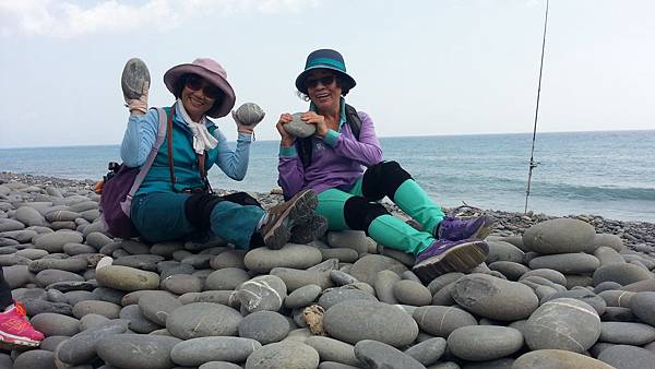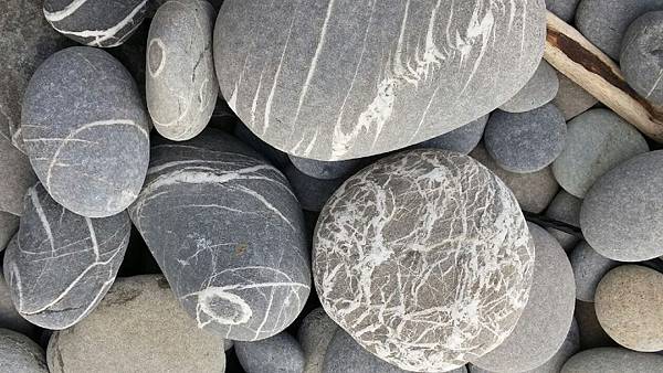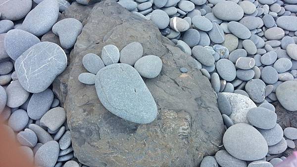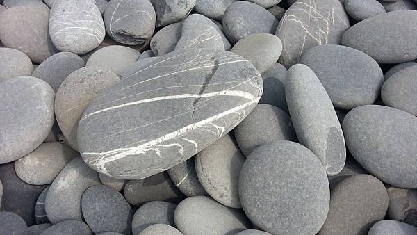 接下來的路還是沿著沙灘走,岩石高高低低,咱們跳上跳下,也一路賞石,當手上抓了一顆最滿意的,眼睛依舊不斷搜巡下一個讚嘆,然後撿起、放下,撿起、放下,與石頭的短暫相會竟是如此趣味盎然。沿途的海灘可說是台灣最美的礫石海灘,踏石而行,彷彿踩在遍地寶石之地,內心激動的不知哪個才是最完美的一顆。千萬年的滔浪琢磨,將堅硬砂岩磨成了可以盈握的奇妙美石,或圓或扁,間帶白色紋路,玩石家皆知的南田石既是產自於此。不同於其他珍稀寶石,南田石並不華麗奇特,而是那經過歲月雕琢的簡單造型,以及帶著行草自由的白色曲線,即使只是一撇,也有著令人讚嘆的美。