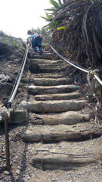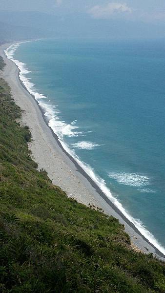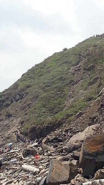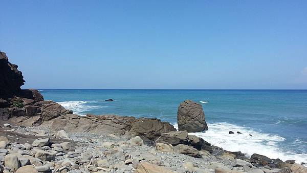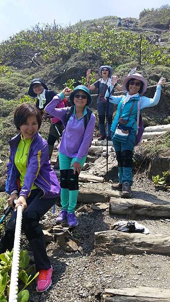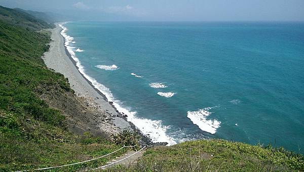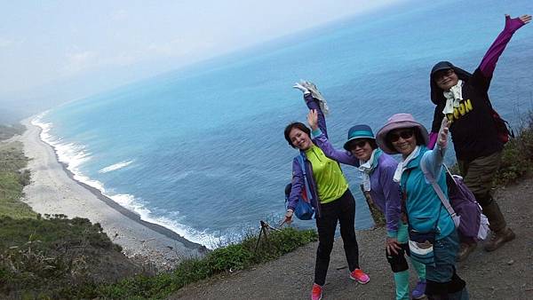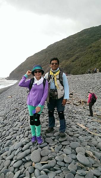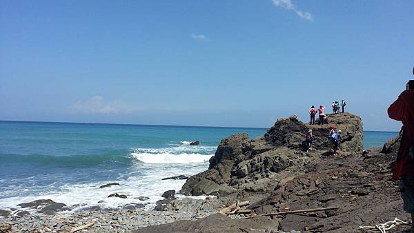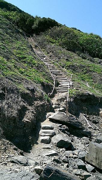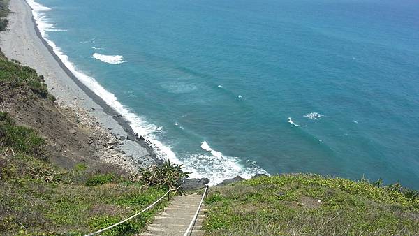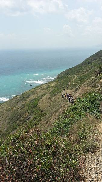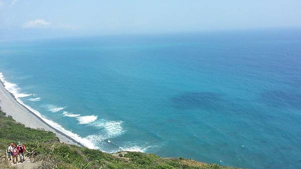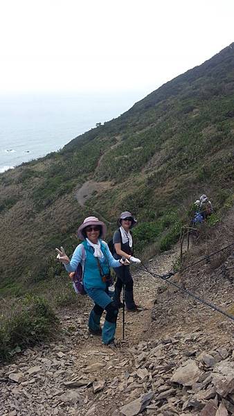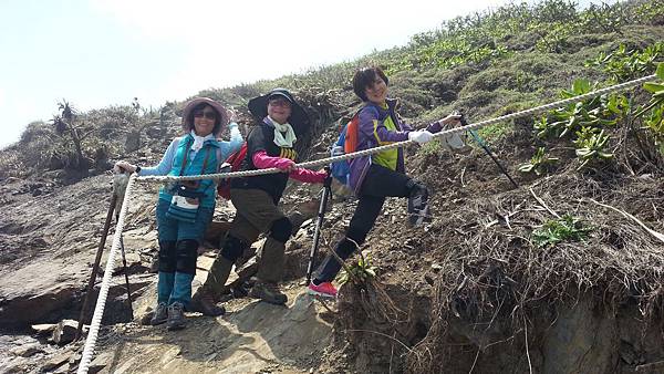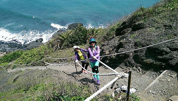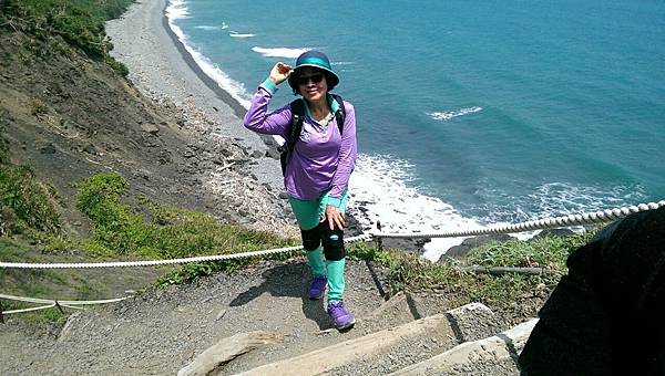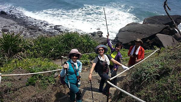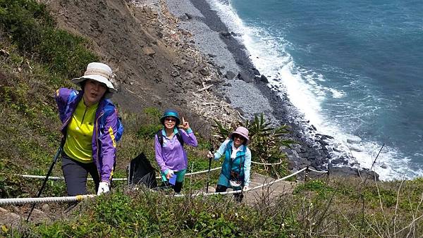 行走在鵝卵石上必需隨時注意自己的腳步,踩偏了容易扭傷腳踝。已經記不清楚走了多久才到達觀音鼻,遠遠地就看見了前方的高繞路段,相當陡峭險峻,雖然已修築了木階,但仍需要拉繩子攀爬著約有70度仰角的碎石坡。大夥兒手腳並用,吃力地往上爬,越爬越高,視野也隨著越開闊,這座海拔超過200公尺的觀音山是古道上最辛苦的路段,無不爬得汗流浹背,氣喘吁吁!登高,就是為了望遠,登頂後再環顧四周景色,東方是遼闊的太平洋,黑潮的深藍連接著淡淡的藍天,山海交臨、山胍直接陡降入海、危岩奇石橫陳、讚嘆大自然美景,美得無與倫比。