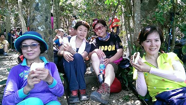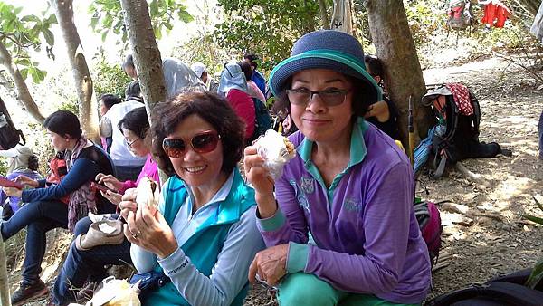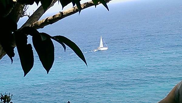 接下來的路段是緩坡灌木叢,漸漸地進入樹林中,海景若隱若現,在林中穿梭了好一陣子後,終於看見其他隊伍數十人在林中開闊處休息吃午餐。選了一處面對海洋的空地上,我們也來享受虎咬豬的美味和飯團的可口,雖然已是冷颼颼的飯團,但面對蔚藍的太平洋海岸,海風輕輕送爽,一艘白色風帆盪漾在海面上,此時不管吃什麼都是五星級的享受。