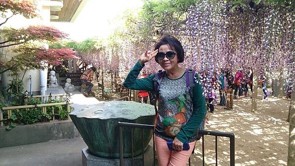 吉祥寺是第一個參觀景點,從吉祥寺公園入口進入,經過一片綠意盎然的香楓樹林和兩旁盛開著杜鵑花的階梯,轉角處便看到古色古香的吉祥寺。位於九州八幡區的吉祥寺前有一大片紫藤花棚架,第一次看到這麽大規模的花棚,簡直看呆了,一串串長約150公分–170公分的紫藤花如簾子般地垂掛著,像紫色瀑布,又像大面積的紫色屏風,人在棚架下走動,伸手即可觸摸到嬌嫩欲滴的花串,每一串都讓人愛不釋手,看得我們驚喜連連!