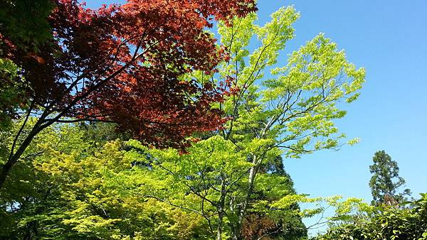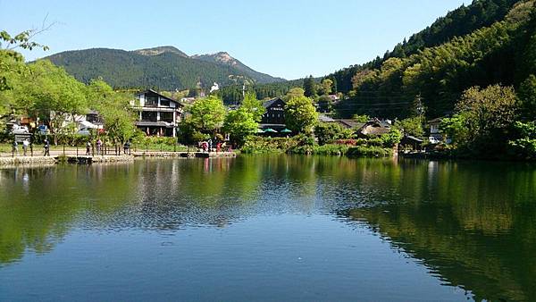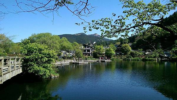 繞著環湖小徑漫步,湖的週遭如綠野仙蹤,剛抽出新芽的楓樹和銀杏綠意盎然,少數幾棵日本楓滿樹楓紅,紅綠夾雜的景色和四周環繞著的由布山岳使得金鱗湖更為多彩多姿。湖邊設有咖啡雅座,如能靜坐湖畔,啜飲一杯香濃咖啡,那將是多愜意的人生。