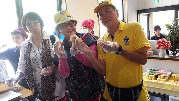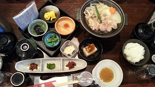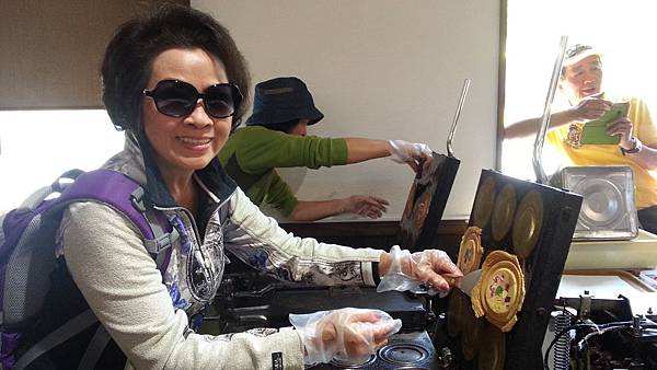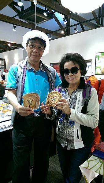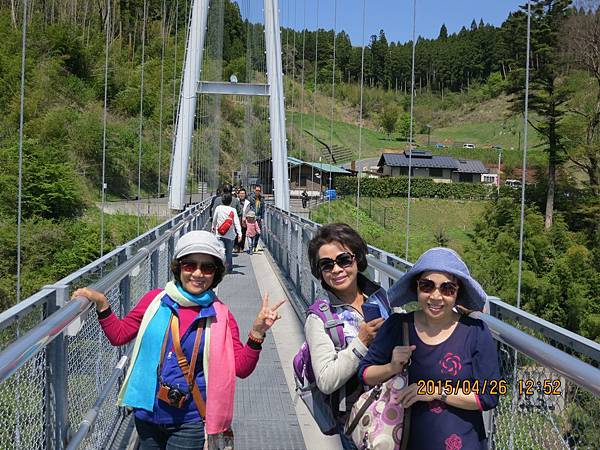 日本人愛吃甜食,從商店販售各式各樣的餅乾、巧克力和紅豆饀和果子等等…便可見一般。今天在由布岳下的一間商店裡,餅乾師傅指導每一位隊員制作押花餅乾。機器和材料都是現成的,先把預先和好的小塊麵團放在印模上,扣緊上蓋模子把麵團壓成薄片並同時烤成金黃色,3分鐘後掀開上蓋,餅乾已烤好,但不急著取下,此時再把乾燥的花材隨意鋪在下模上,重新把上模蓋上,一分鐘後,押花餅乾便大功告成,那是給自己的一份獨一無二的禮物,雖然我不愛吃餅乾,但用看的也很開心。餅乾的香氣四溢讓大家都不禁肚子餓了起來,於是移步至商店後方的餐廳享用湯布院陶板雞料理。午餐後,下一站是1.5小時車距的『九重夢大吊橋』。