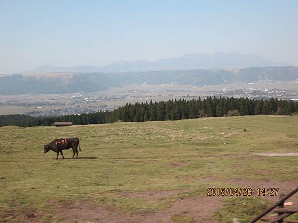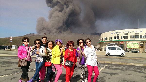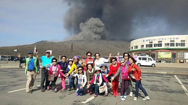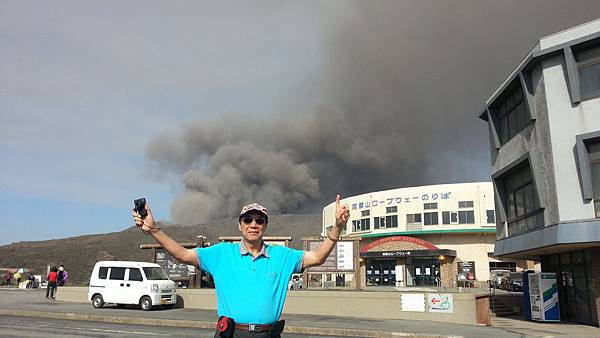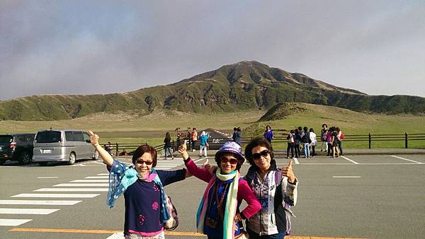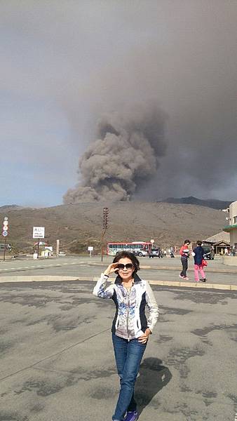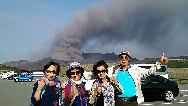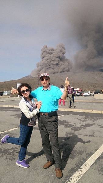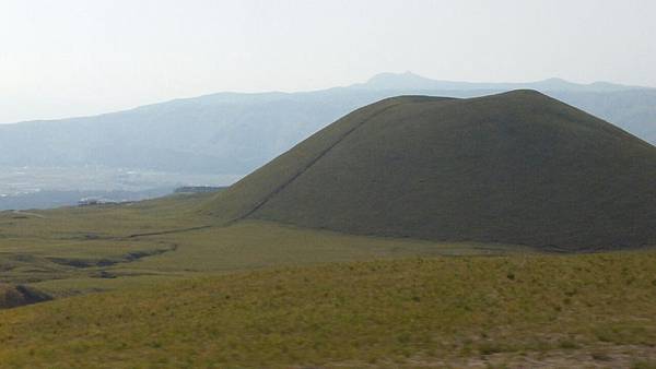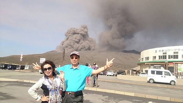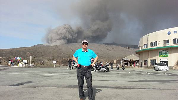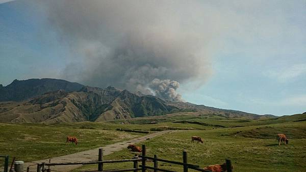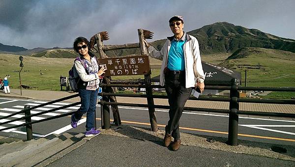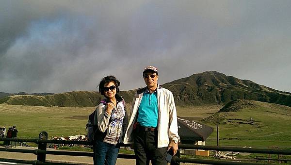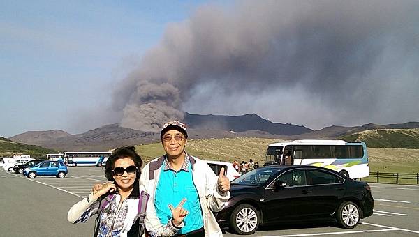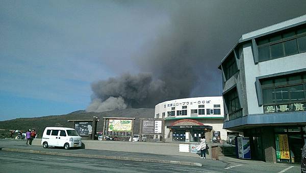 阿蘇中岳海拔1592公尺,是世界上現存少數仍然活動頻繁的活火山,群山中共包含了十多個噴火口,非常壯觀。車子進入阿蘇市後,遠遠地,我們就已經看得到阿蘇火山的上空一片烏黑,濃煙直往上竄,好像隨時有爆發的危險。