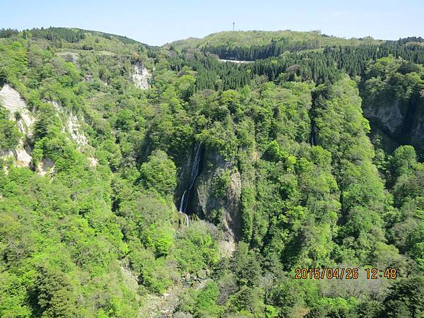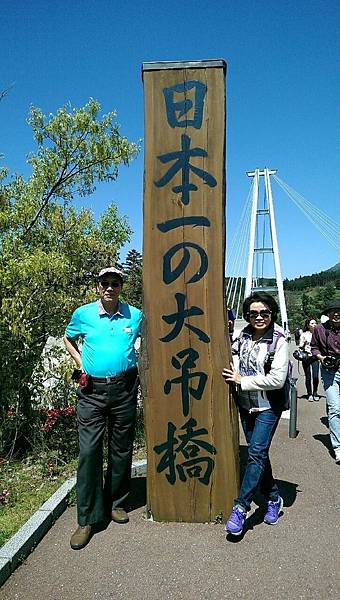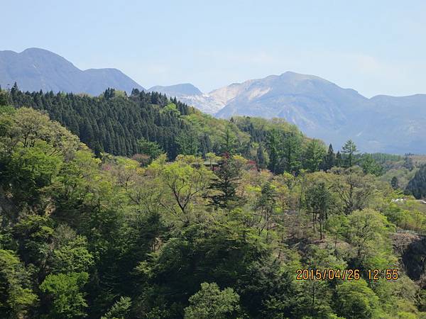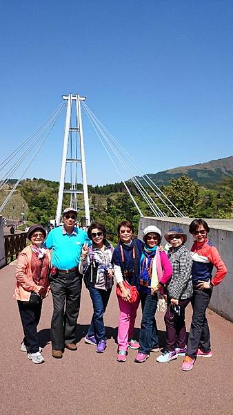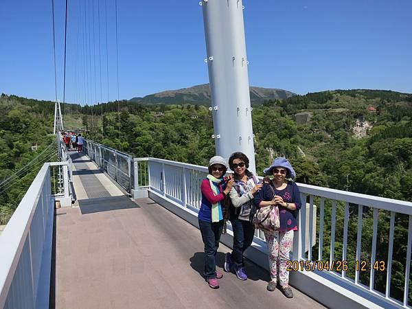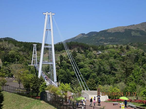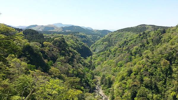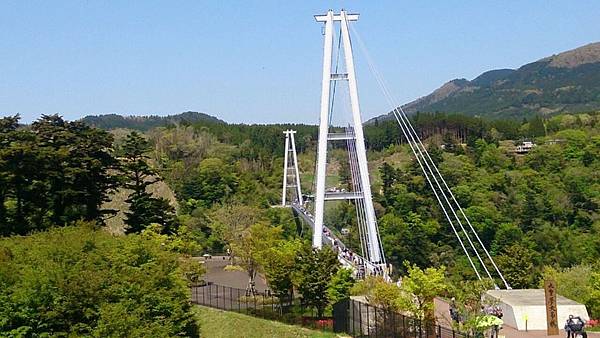 有著一個夢幻名字的九重夢大吊橋是日本的天空步道,座落在九州東北邊的大分縣境內,是日本最大的行人專用吊橋,橋高173公尺,橋面寬1.5公尺,總長度是400公尺。鋼索吊橋橫跨兩座山谷之間,橋的落差超過700公尺,橋下是鳴子川溪,橋面採半透明格子網狀設計,行走橋上,可以感受到橋在輕微搖晃,猶如漫步在雲端,走到橋中央可以俯瞰整個鳴子川溪谷,這裡的360度無障礙視野,可以把吊橋的週遭景物一覽無遺。吊橋左邊是山巒翠疊,壁立千仞,右邊是兩座著名的『震動雌雄瀑布』,由於距離太遠,只覺得瀑布如銀河倒瀉,但聽不到瀑布聲響。來回走一趟九重夢吊橋,飽覽整個景區風光後,行色匆匆的我們將進入九州的中部地區~熊本縣。