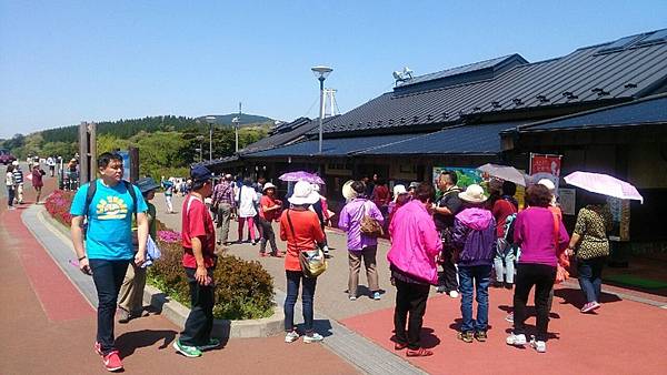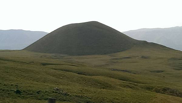 正當大夥兒議論著火山時,車子正好經過一座呈圓錐狀的小山丘~米塚。米塚是一座三千年前才冒出來的新火山,雖然高度不到100公尺,但卻有一個直徑380公尺的火山口,米塚的山坡上不長樹木,只有一片綠油油的草皮,相當獨特,顯得清麗可愛。