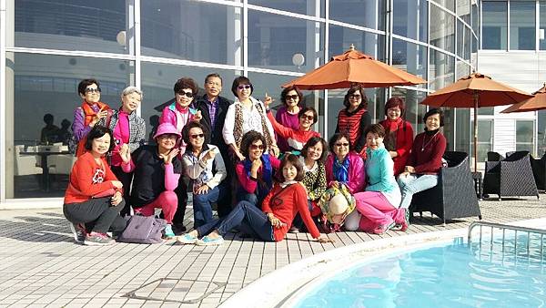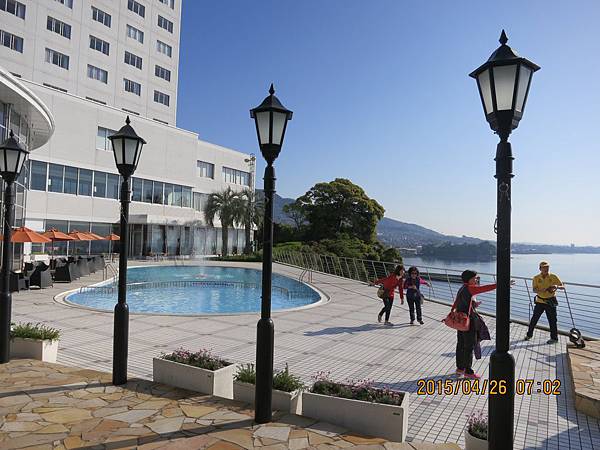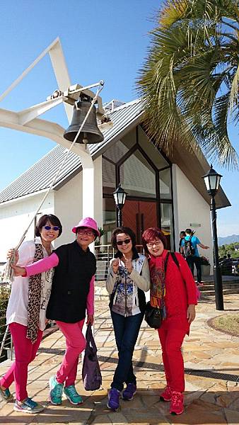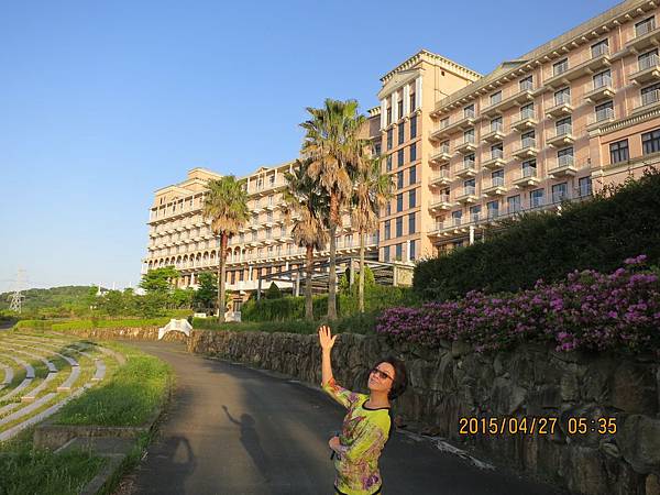 昨夜住宿別府灣溫泉飯店,飯店依傍在別府灣旁,從房間窗外看出去的景色就是一片遼闊的海灣。風和日麗的早晨,和煦的春陽照耀在眾姐妹們歡樂的笑臉上,原來大家都習慣早起,已紛紛在飯店的週遭拍照了。露台上遠眺別府灣,碧波盪漾,海天一色,湛藍的海面上三兩隻海鳥低空飛翔,帶著愉悅的心情迎向美好一天的開始吧!