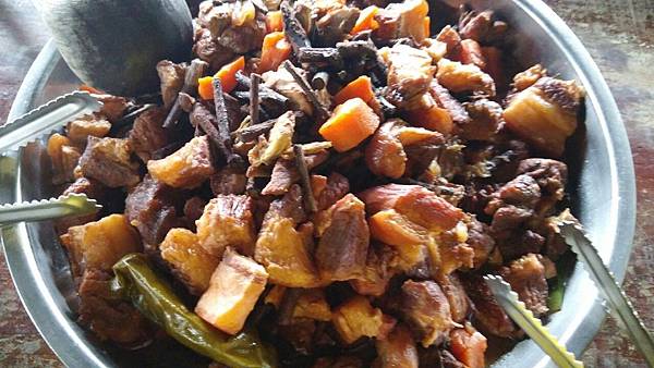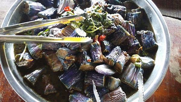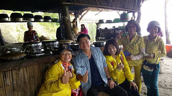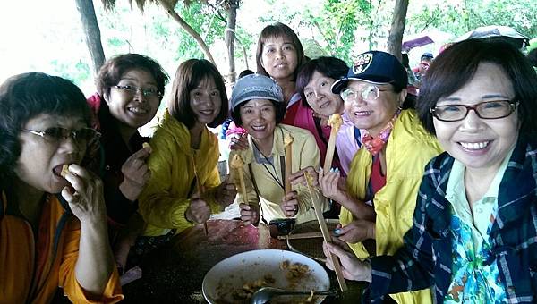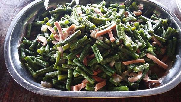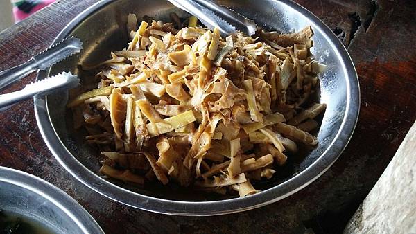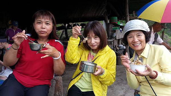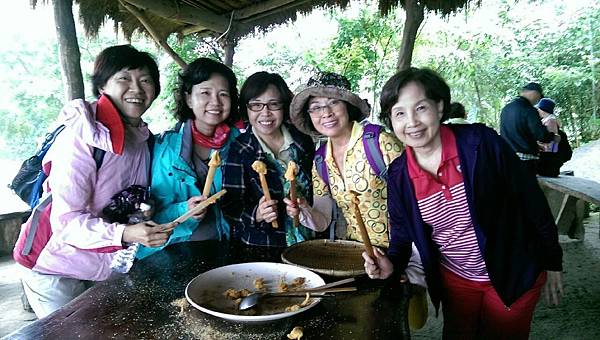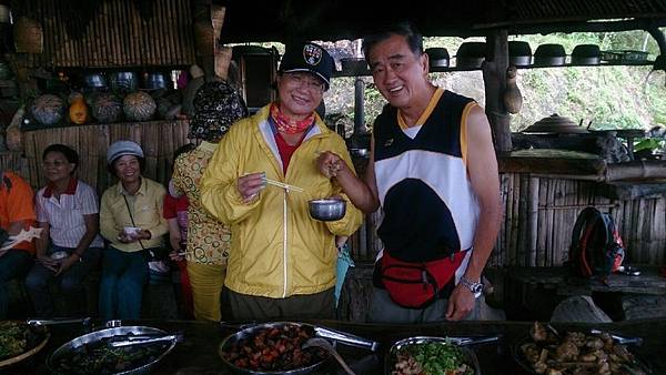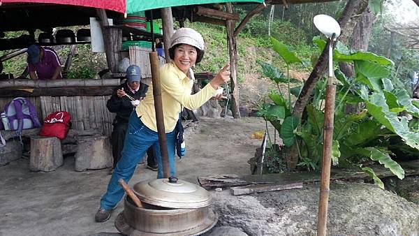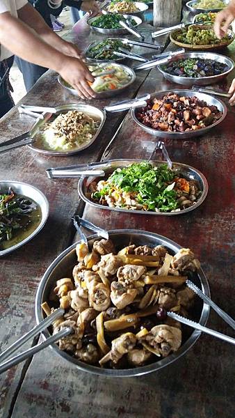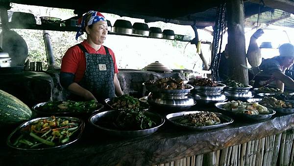 當大夥兒在森林中玩得不亦樂乎時,山中的廚房也在忙碌著、這裡沒電,廚房的大灶用的是木柴生火炊煮,食材也是族人自己栽種,雞肉和山豬肉也全是自己放山飼養,滿桌的原汁原味讓人看了都忍不住食指大動,除了煑得香噴噴的米飯外,其地琳琅滿目的菜餚有:紅燒肉、天婦羅、南瓜、地瓜、地瓜葉、山苦瓜、烤山豬肉、多種蔬菜、長荳、桂竹筍、茄子等等…大約有20多盤菜,還有一大鍋筍子排骨湯,真是澎湃勝過辦桌。阿力曼很注重環保,他規定每人要自備環保碗筷,吃多少拿多少,不可浪費食物。我記得那天大家都吃很多,因為實在太好吃了!