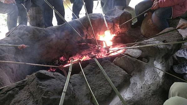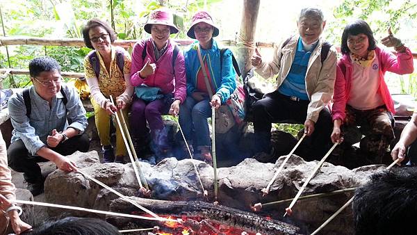 參觀了會走路的一大片白榕,四部九人座休旅車奔馳在蜿蜒的產業道路上,很快地停在另一片森林前的空地上,老師帶領我們再度踏入原始的森林小徑,先在一小斜坡上舉行迎賓典禮,傳統茅草屋內土坑上早已生起紅通通的碳火,竹韱上串著山豬肉,只要伸進碳火中烤熟就可以大快朵頤了,搭配著布農族特釀的小米酒,甜香滋味滿足了大家的味蕾,香蕉和布農族人俗稱的〝獵人舒跑〞(肉桂葉茶) ,更讓人再三回味。