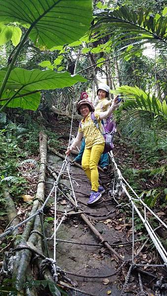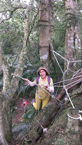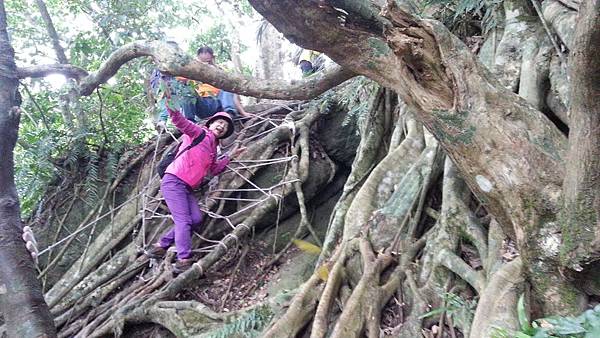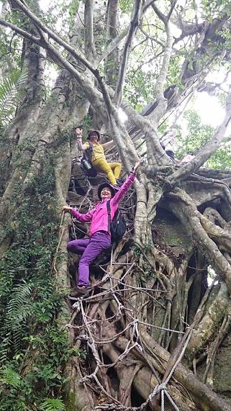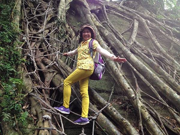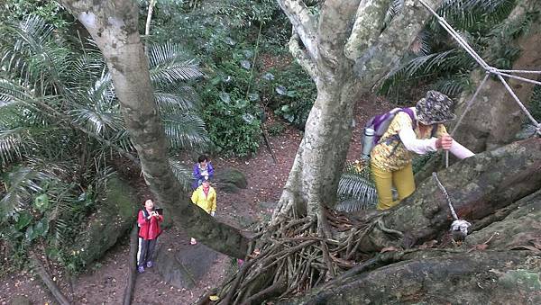 森林中處處可見充滿了強大生命力的大樹和岩石,體驗行程中,我們必須倚靠雙手與雙腳接觸著大地,在氣根林中迂迴穿梭,攀爬岩壁、攀登大樹、這裡沒有木棧道、沒有石階梯,爬上兩三層樓高的大樹要手腳並用,兩手抓住大小不一的氣根、腳要穩穩地踩在樹根上或繩索上,透過雙手的觸摸、心靈的感受,一步一步往上攀登的感覺非常刺激,也讓我想起童年時候爬果樹偷摘水果的回憶。