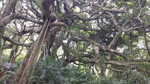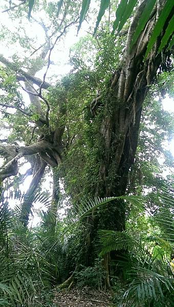 今天天氣不佳,時而飄著小雨,時而放晴,走在潮濕的原始林中,穿過濃密樹間的光線漫射,百年的榕樹,氣根四處蔓生,岩壁、巨石與灰蒙蒙的情境,真有一種置身於電影阿凡達中的場景。