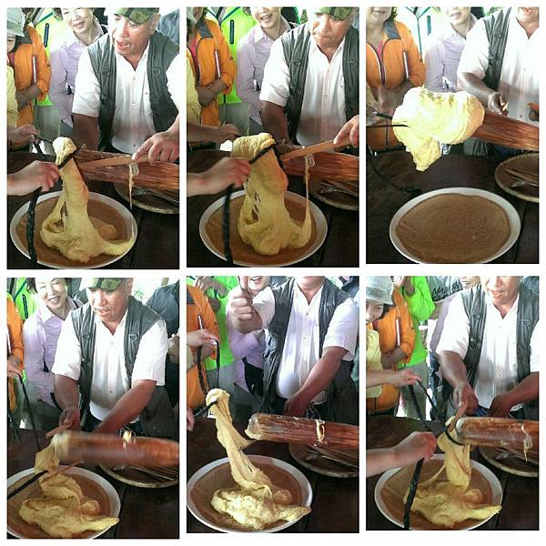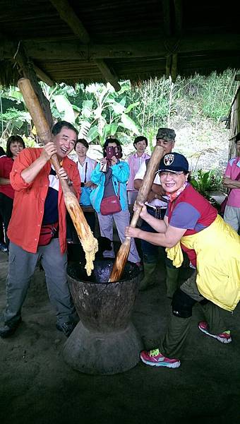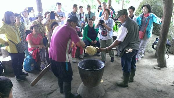 用過餐後,大家輪流親手搗小米麻糬,奮力搥打之下,熱呼呼的麻糬變得很Q彈,沾上花生粉後更加美味可口。