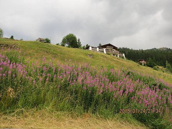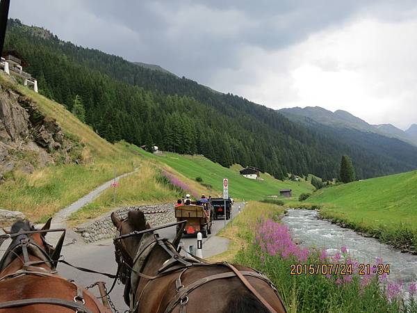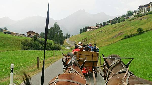 遠離都市塵囂來到達沃斯小鎮,就必需徹底的放鬆心情,於是,搭乘馬車遊覽這一片綠色大地,探索這裡著名的山谷和田野景觀。馬車沿著小鎮的Promenade街道慢慢往前行,經過小橋流水景致,漸漸走入市郊鄉間,兩旁綠油油的草坡上點綴著繽紛多彩的小野花,一棟棟小巧的木房子在草坡上,顯得寧靜、安祥。坐在馬車上,任由微微的涼風輕輕吹拂,伴隨著答答的馬蹄聲和獨特的原野風光,真是一趟永難忘懷的體驗,可惜在最後一小段路時卻下雨了,所幸雨勢不大,來得快,去的也快。