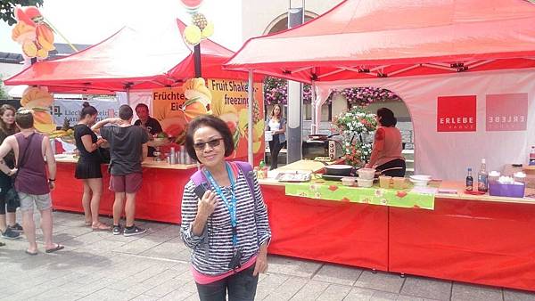 循著街道往前行是市政廳、教堂、Josef公爵雕像和民居,觸目所及皆是綠意盎然,戶戶有花的美麗環境。由小教堂折返回到熱鬧的街上,街景除了佈置溫馨的咖啡室雅座外,便是小巧的街邊小攤販,賣的東西琳琅滿目,令人讚賞的是販賣果乾和蛋糕甜品的攤位上不見有蒼蠅,只有嗡.. 嗡.. 嗡的小蜜蜂飛來飛去!