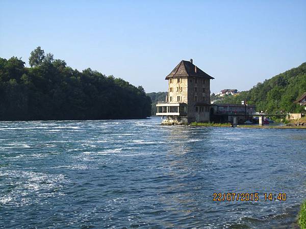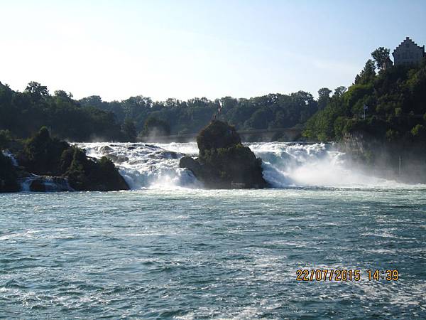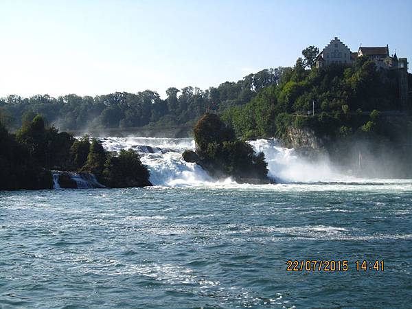 走在岸邊的步道上,轟隆隆的瀑聲震耳欲聾,貫流而下的瀑水聲勢浩大,相當壯觀。岸邊的小古堡靜靜地佇立著,古堡和瀑布相呼對應,形成一幅典雅美麗的風景。
