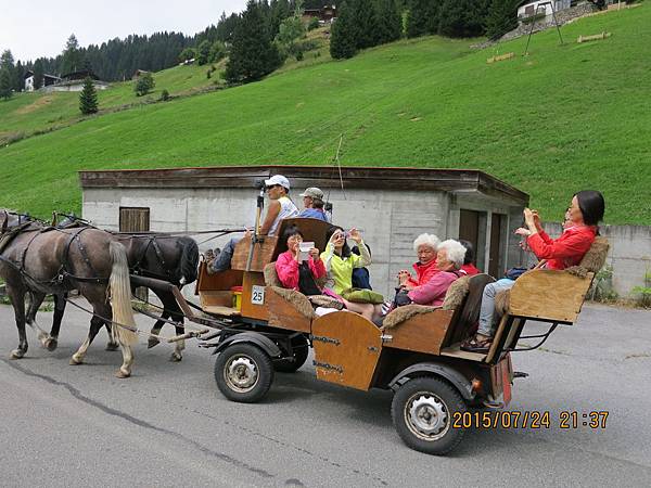 下午1:05分離開列支敦士登國境前往瑞士阿爾卑斯山的著名小城達沃斯(Davos) 。走了半天的行程後,大夥兒也累了,途中補眠外便是聆聽何導的詳細解說,抵達達沃斯已是下午2點,先到Silvretta Shopping 超市採購一些用品、水果或餅乾類的東西,接著到Davos Dorf 乘坐馬車暢遊達沃斯小鎮的風光。