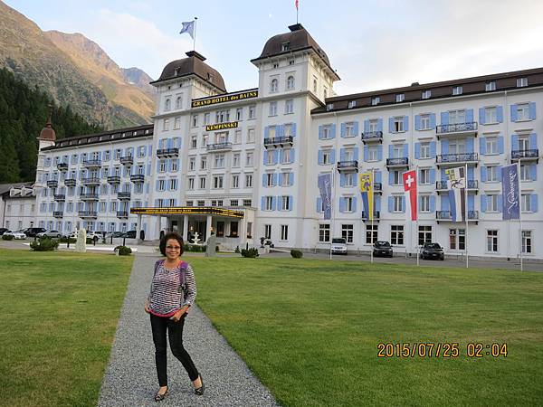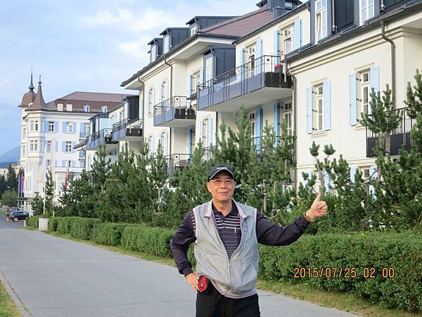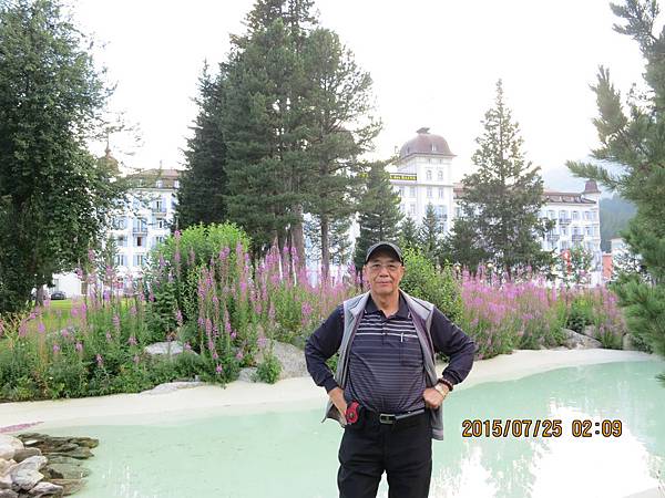 返回Kempinski飯店,大夥兒在附近散步。飯店建築是與藍白色的搭配,漂亮舒適,聖模里茲湖又近在咫尺,明天要早起到湖邊走走,今天就到這兒囉!晚安!