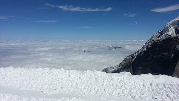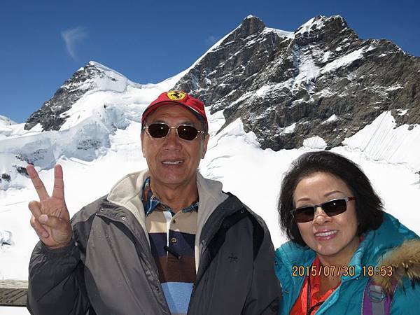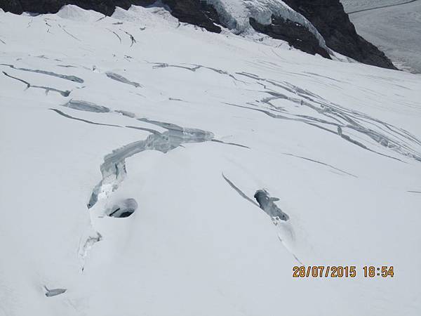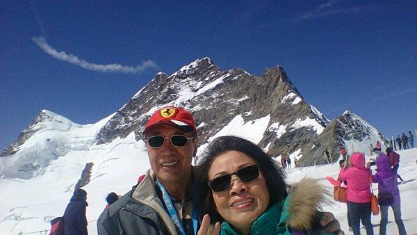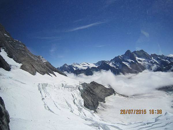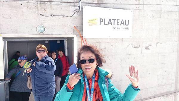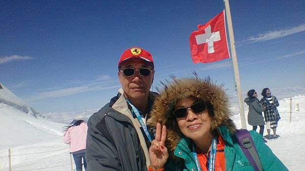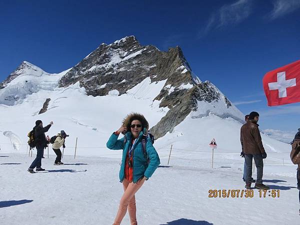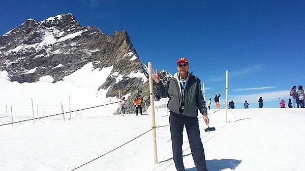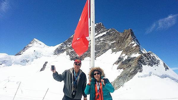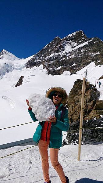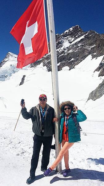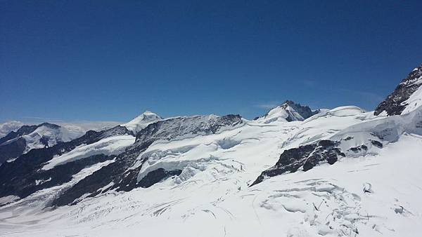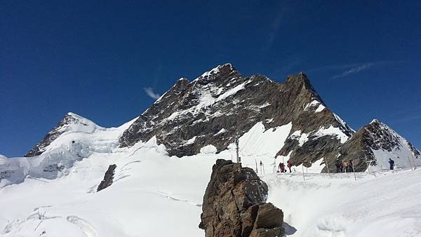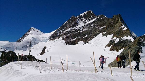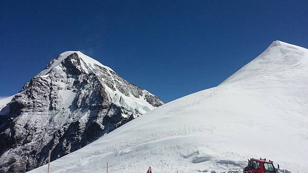 從觀景台下來後是自由參觀時間,我們穿越通往戶外的隧道進入白雪世界裡,出現在眼前的少女峰三座主要山峰一字排開,呈東西向排列;由東而西分別為艾格峰、僧侶峰和少女峰,三峰的高度分別為3970m、4107m、4158m,漸次升高。在戶外的銀白雪地平台(Plateau)上,一面紅白顏色的瑞士國旗迎風飄揚,後方就是海拔4158公尺的少女峰,能直接觸摸到落在少女峰上的美麗白雪的確令我興奮不已。