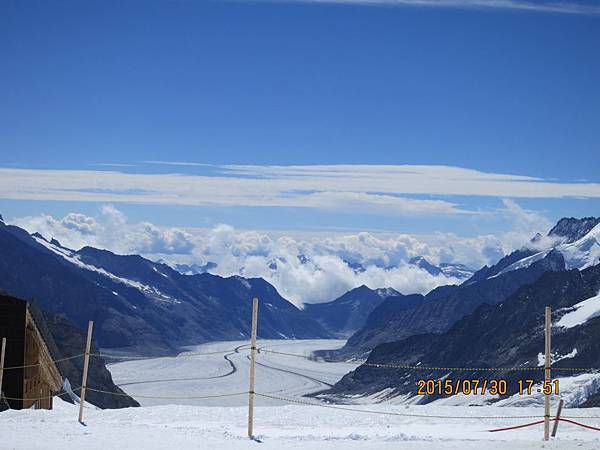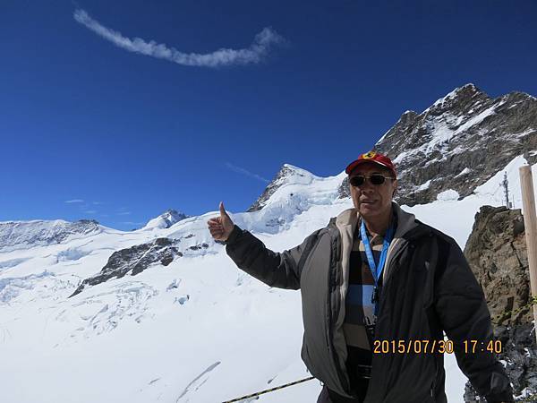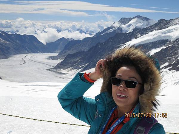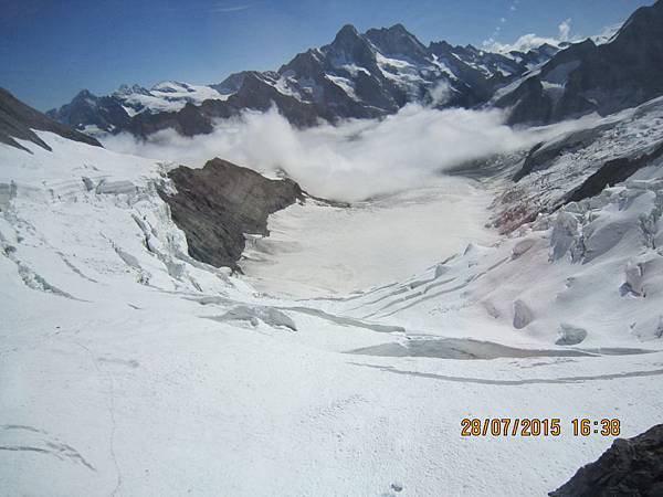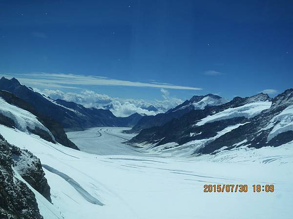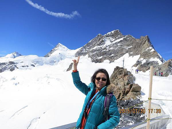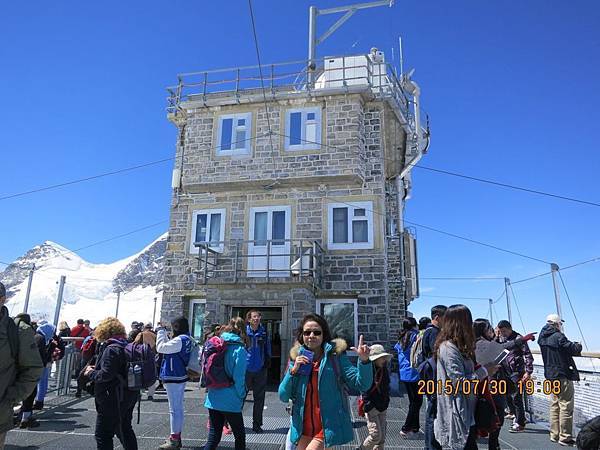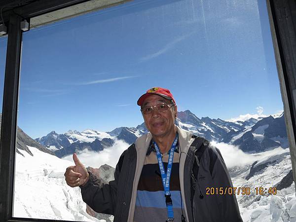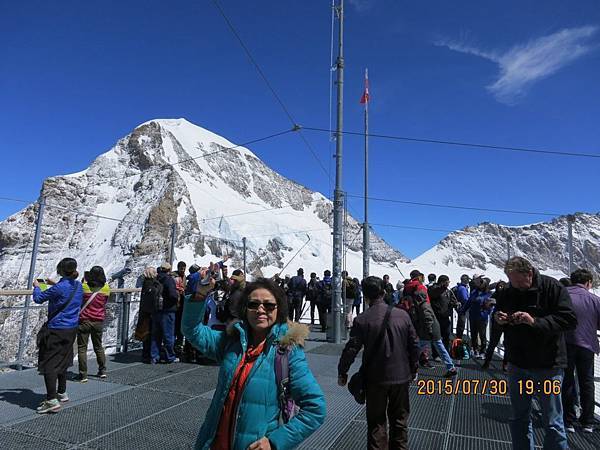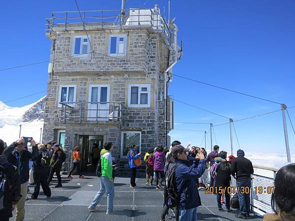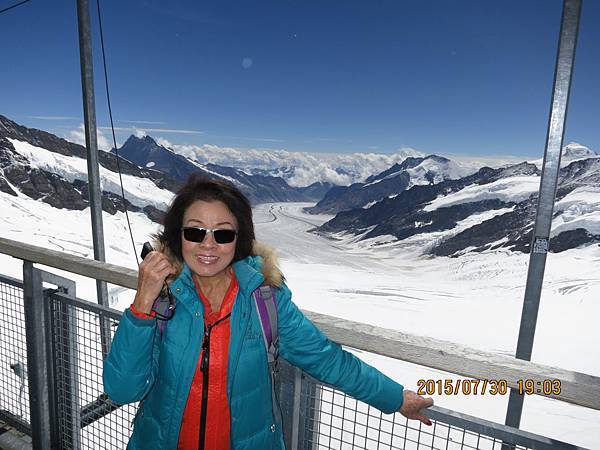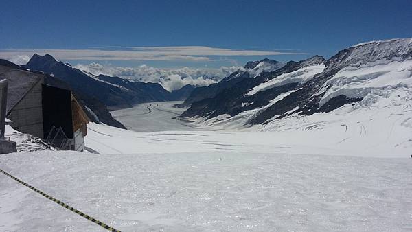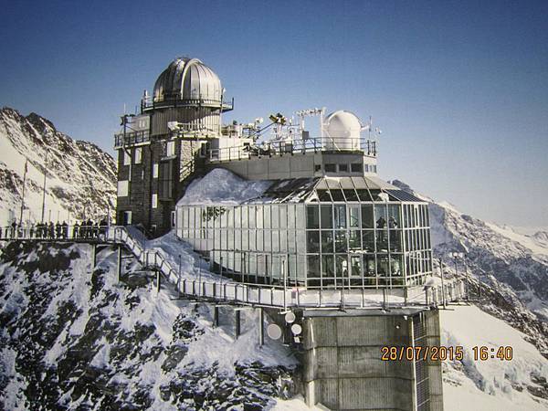 何導隨即再帶我們搭乘全歐洲最快速的電梯直上海拔3571公尺高的史芬克斯(Sphinx Terassen))觀景台。站在號稱歐洲屋脊(Top Of Europe)的少女峰觀景台上,阿爾卑斯山山脈中最讓人驚心動魄的全景圖就可以盡收眼底,而冰河的視野,更加廣闊,可將下方的巨大阿雷奇冰河(Great Aletsch Glacier)一覽無遺。阿雷奇冰河是全歐洲最大且最長的冰河,寬1.6公里,全長23公里,冰層最厚之處達900公尺。冰河的右邊就是美麗清純的少女峰(Jungfrau)。在觀景台上可享受360度的全景,這裡也有一座歐洲最高的天文台,是觀察星象和氣象的最佳地點。