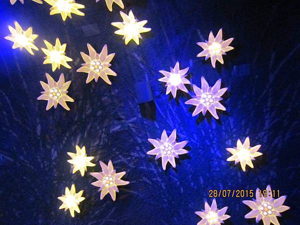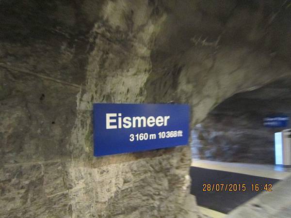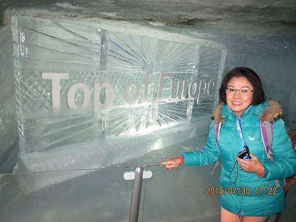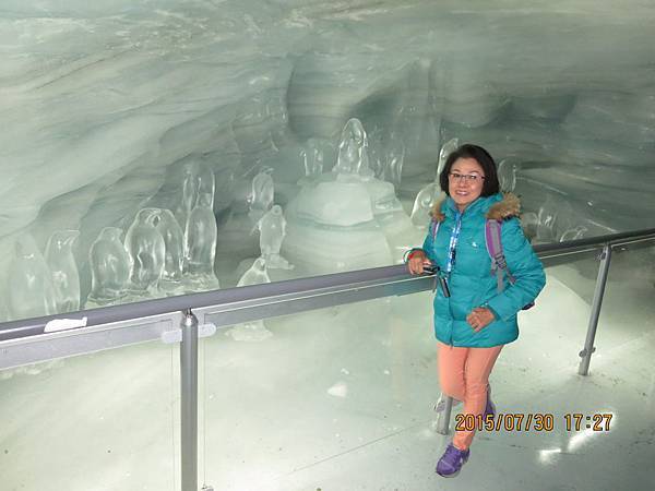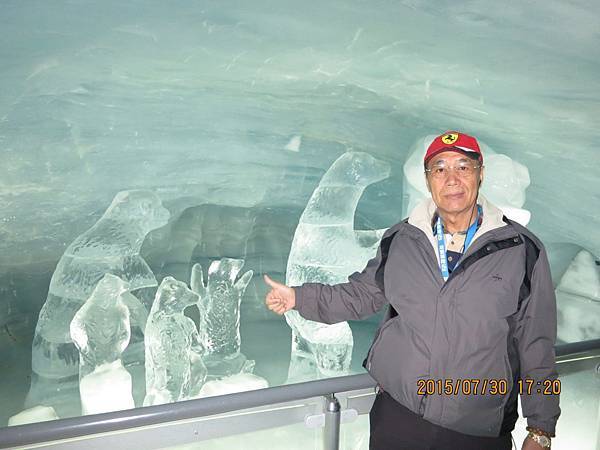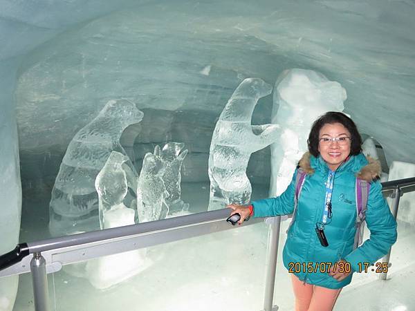 車站大廳內附設餐廳、郵局、硏究站、商店、放映室、紀念品店和餐廳等,首先跟著何導沿著指標進入冰宮(Eispalast)參觀。由於海拔的關係,這裡終年結冰,因此在冰層中建造了冰洞。通過一條長長的冰隧道後,進入終年保持零下3度的冰晶大廳,各式冰雕藝術整齊陳列在冰宮內;有栩栩如生的北極熊、老鷹、愛斯基摩人、企鵝等等….尤其是燈光照射下,閃耀著與眾不同的藍白光芒,格外炫目