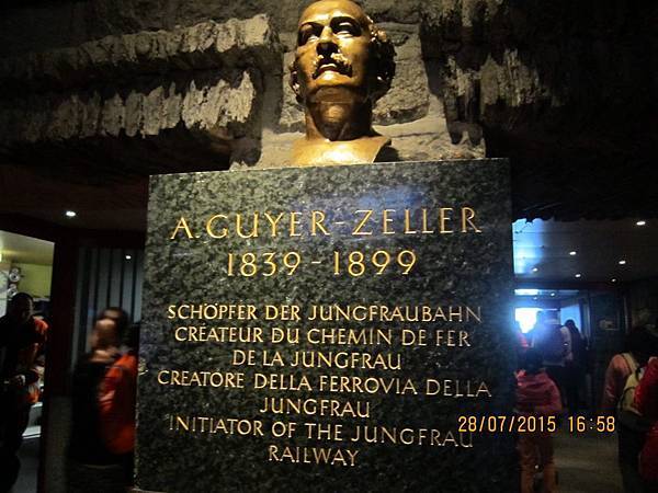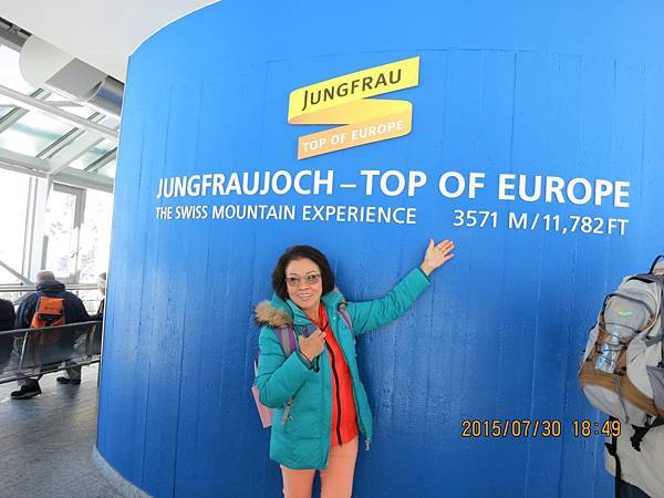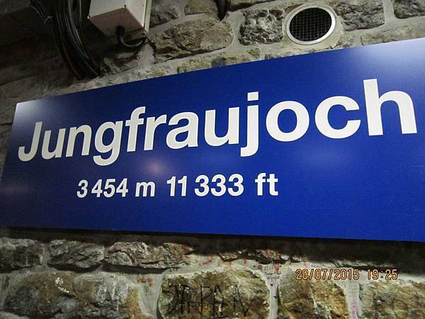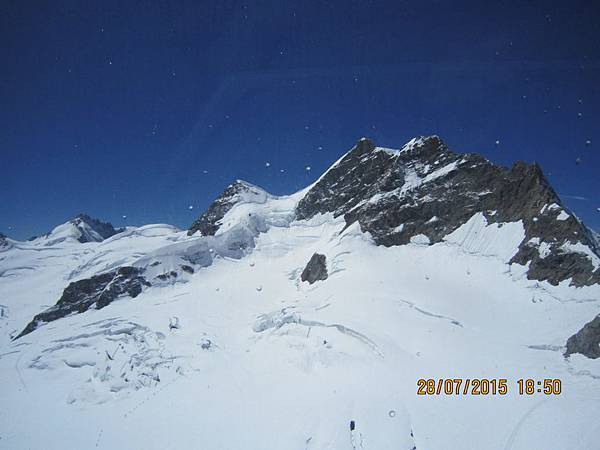 列車加足馬力沿著山壁攀爬,車窗外開始出現殘雪,然後是一整片銀白色的世界了!!看雪的潔白和山的崢嶸,強烈的白與黑對比,酷啊!不知不覺經過40分鐘,火車抵達海拔2061公尺的夏戴克(Kleine Scheidegg),我們要下車到對面月台,換乘另一部火車。火車沿著山壁攀升,最後進入一條長長的隧道,在海拔2865公尺的艾格石壁(Eigerwand)隧洞中停留五分鐘;然後又在3160公尺的冰海站(Eismeer)再停五分鐘。在短暫的停車時刻,我們可以去觸摸隧道的裸岩石壁,體驗這段工程的艱辛,也可以看到Adolf Guyer Zeller的紀念雕像。車站裡面還有一大片玻璃觀景窗,看出去正是艾格峰冰河的遼闊視野和最令人驚嘆的冰海景觀,或者上個廁所,但是時間真的太趕了,匆匆一瞥便要趕回車上。接下來就抵達海拔3454公尺的歐洲最高火車站(Top Of Europe)~少女峰站(Jungfraujoch) 了。由夏戴克(Kleine Scheidegg) 到少女峰車站,上山需50分鐘,下山只需要35分鐘。