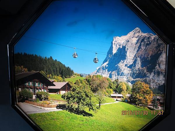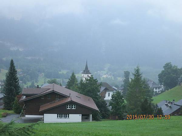 格林德瓦的海拔是1067公尺,是少女峰山區最美的渡假小鎮。鎮上處處是森林木屋、寬闊的田野和終年積雪的山巔。步出戶外,迎面而來的冷洌空氣中有花草的芳香味,下過雨後的花草樹木上還殘留著露珠兒呢!在飯店附近隨意蹓躂,拍照,此時小鎮上的教堂正傳來悠揚悅耳的鐘聲,叮叮噹噹的美妙音符在整個山谷中迴盪著,有餘音嬝繞的感覺。鐘聲寧靜人的心靈,使人暫時忘記都市塵囂,享受當下大自然的渡假與慢活哲學。