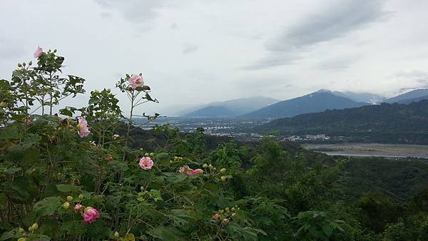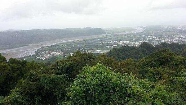 從登山口下車後,再小心翼翼走上240個木階梯,終於抵達 山頂上的涼亭和觀景台。涼亭四周別無更高的山巒遮蔽視線,視野極佳,可俯瞰整個台東市區依傍著太平洋,卑南溪繾綣著卑南大山,以至花東縱谷上的中央山脈南段群峰聳立,台東平原、卑南溪流、中央山脈稜線、知本主山、都蘭山、太平洋、河流和拱橋、機場跑道、椰林和果園等等。從四格山山頂環視,每個角度的遠近景觀都有不同,這時候雨也停了,能見度更佳,加上涼風習習吹送,令人心曠神怡。