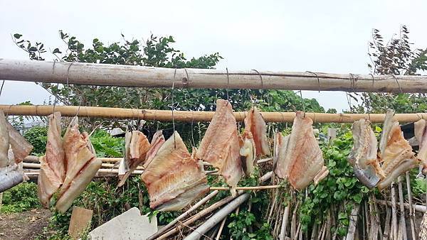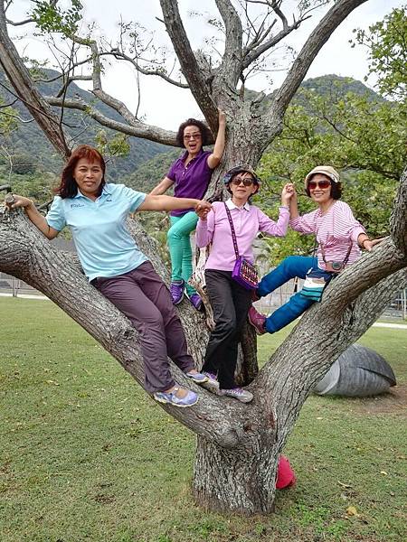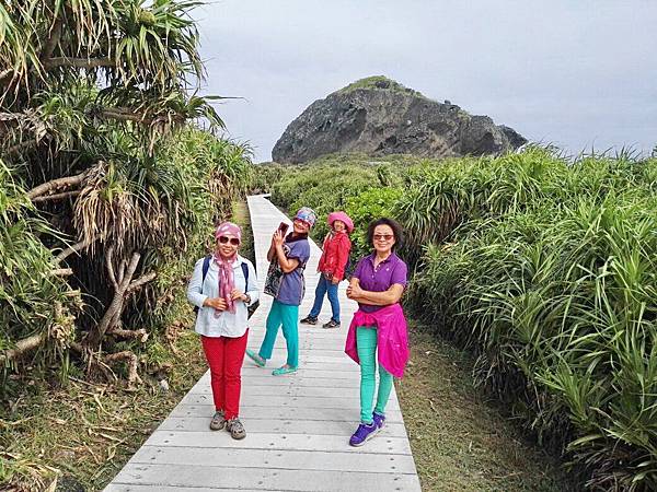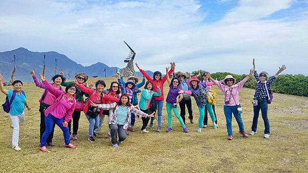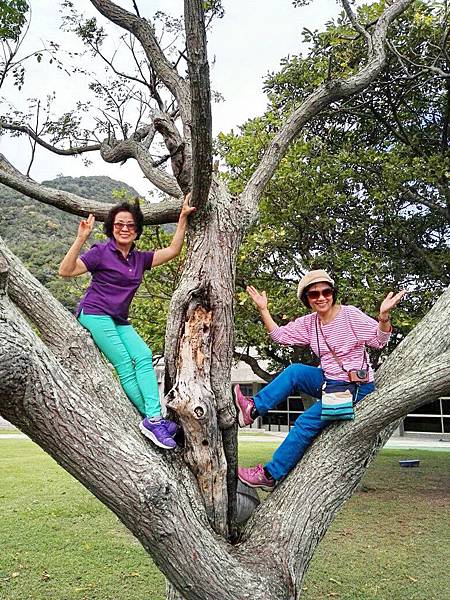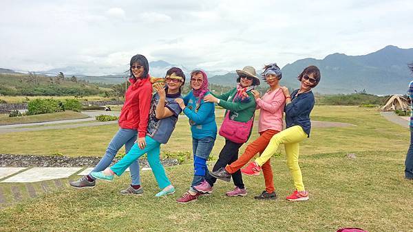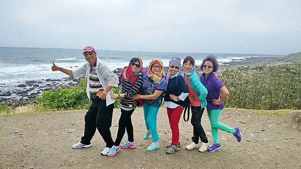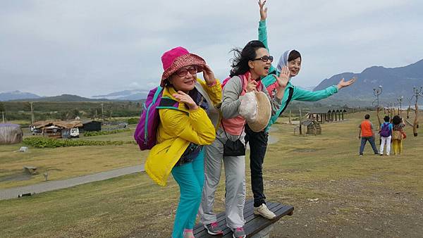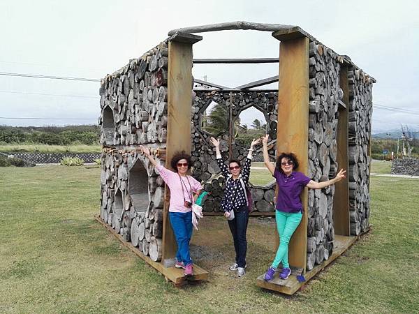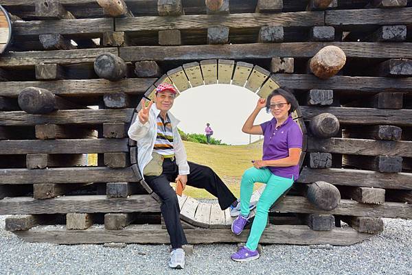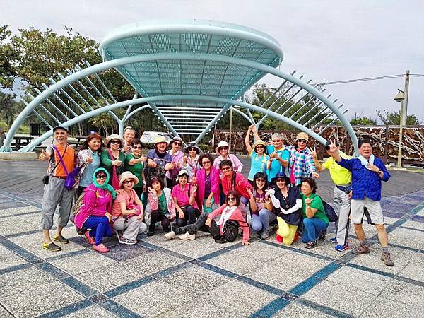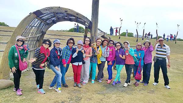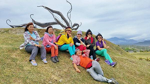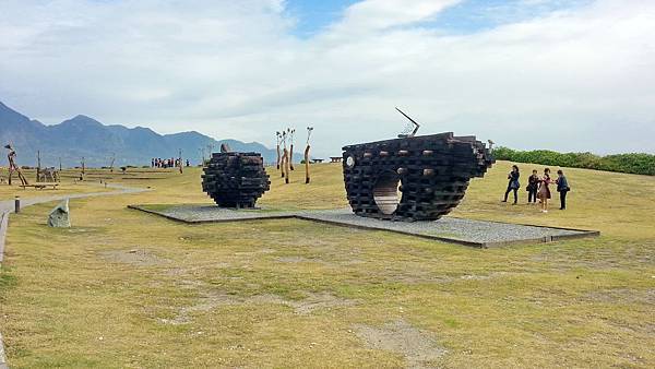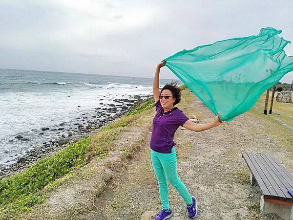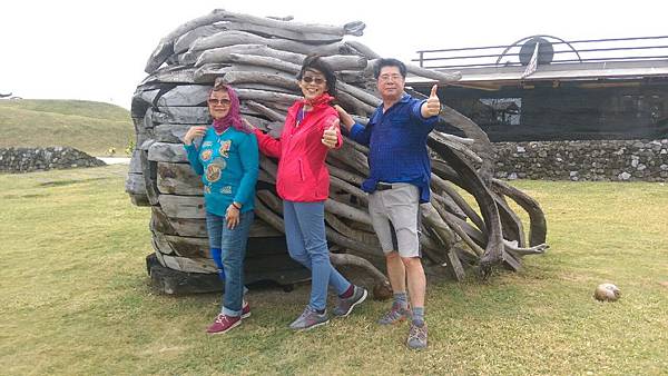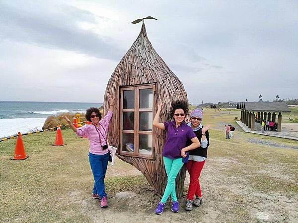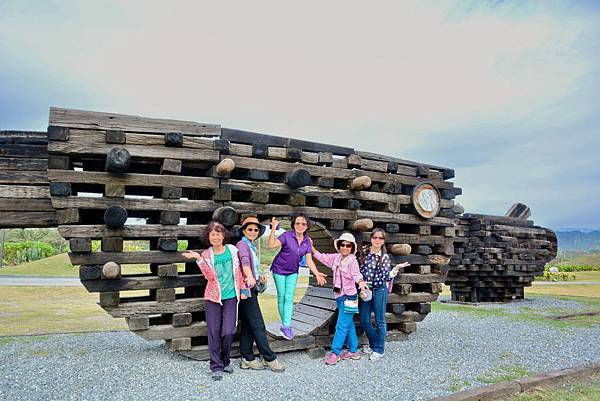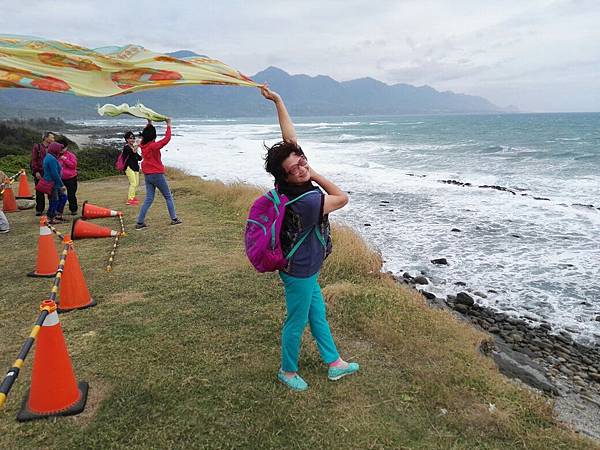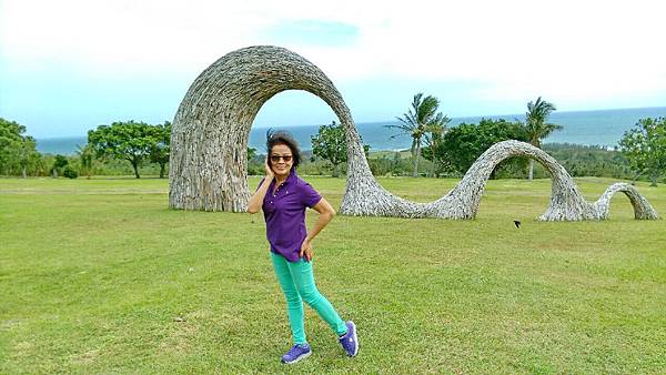 除了欣賞自然美景之外,園區內也有不少由漂流木所組合而成的裝置藝術作品,其中有兩條魚矗立在海邊,取名為「我的好朋友」,另外還有竹編以及廢鐵片制作的瓊麻花、「哭泣的露珠」等等,連休憩涼亭中的裝飾也可見漂流木的蹤影。愛拍照的姐妹們在園區內瘋狂拍照,尤其愛讓美麗的絲巾隨風飄揚所展現出來的美感,一時之間,園區內只見五顏六色的絲巾在強風中飛舞著,為這片灰暗的天色增添了繽紛的色彩。