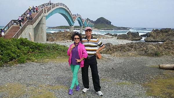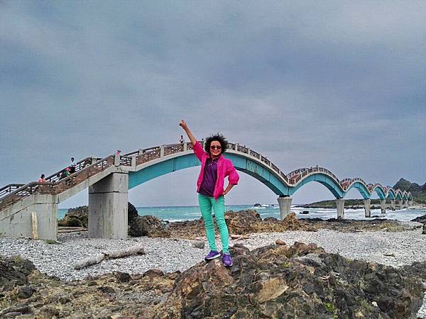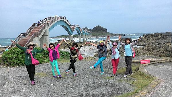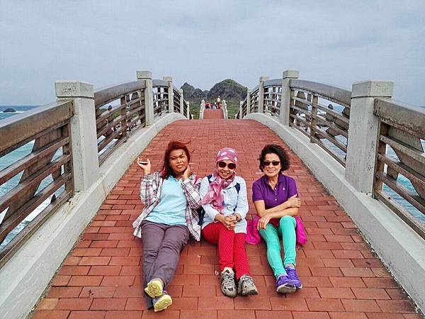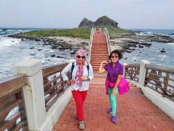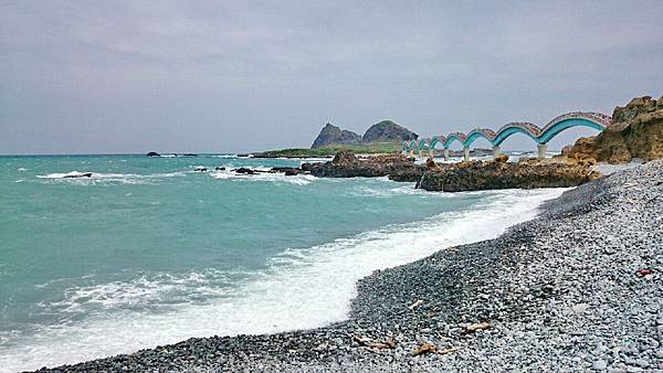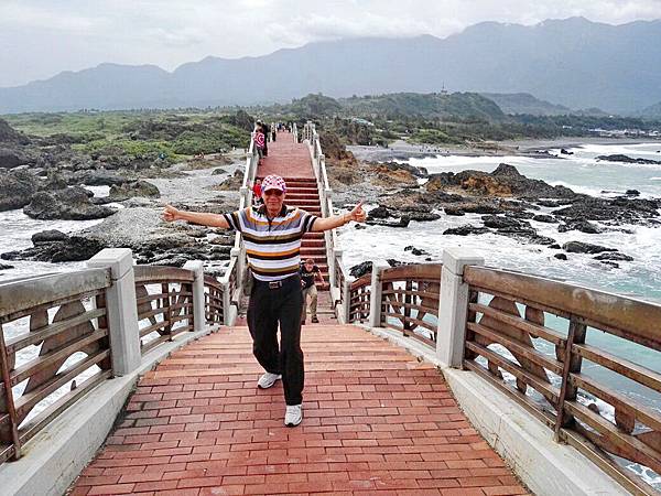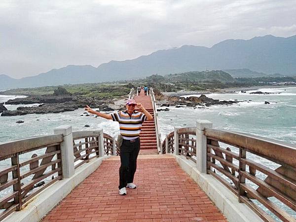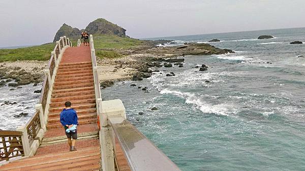 三仙台跨海步橋,長度約400公尺,共有八個拱橋連接而成,灰色與藍色的橋身橫臥,紅色台階,造型獨特美觀。行走在拱橋上感覺很震撼,因為海風實在太強了!在橋上佇立片刻,俯視海水,只見白浪滔滔拍打著礁石發出嘩啦啦的巨響。過了拱橋,登上三仙台,這裡設有整齊的環島步道,步道兩側長滿了林投和白水木等濱海植物,島的四周珊瑚礁環繞,由於強烈的風化和海蝕作用,讓島上除了仙劍峽、合歡洞天然奇景外,海岸邊還散佈著海蝕溝和壺穴等海蝕景觀,登島遊覽探幽訪勝,令人感覺舒暢開懷。