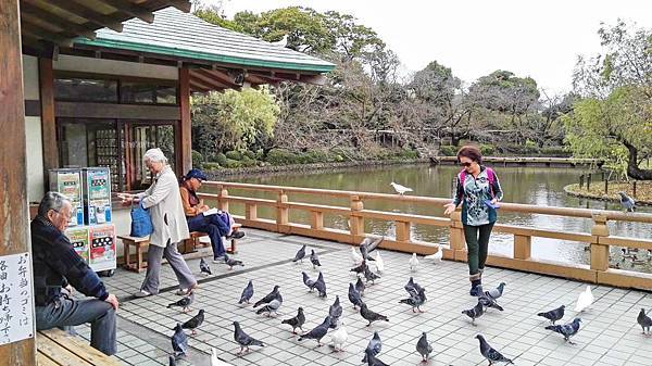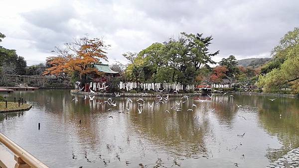 八幡宮的幅員相當大,園中前方還有一個小湖泊~源平池,成群的白鴿在湖畔等待著遊客餵食,吃飽後再朝湖心群飛而起,形成一幅壯觀的畫面。繞著林園走回若宮大道集合,接著前往高德院參觀著名的鎌倉大佛。