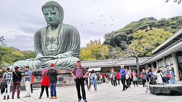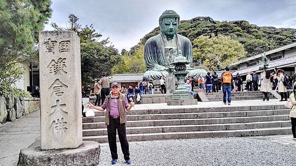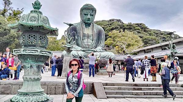 步入高德院內,我抬頭搜尋大佛的踪影,原本以為大佛一定是像台灣彰化八卦山的大佛那樣數十公尺高高在上,後來才發現鎌倉大佛其實只有13.35公尺,重121公噸。從1238年開工,共花了6年時間完成木雕大佛,到1252年才修建為金佛,一次海嘯,吞噬了供奉佛像的大佛殿,只剩下青銅大佛孤單單地座落在露天台座上,現在已成為現存鎌倉的佛像之中唯一的國寶,已有將近800年的歷史。