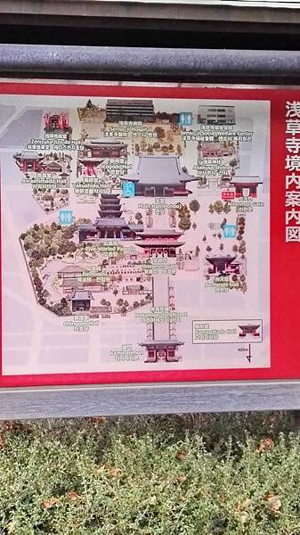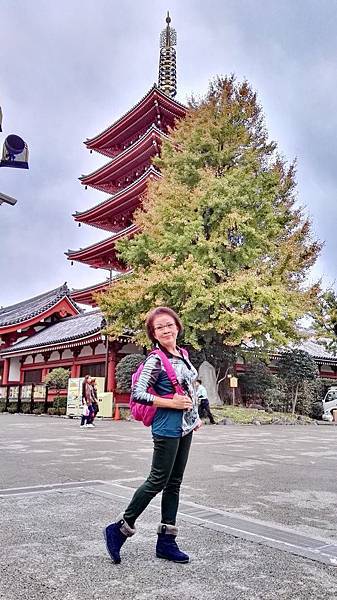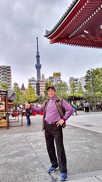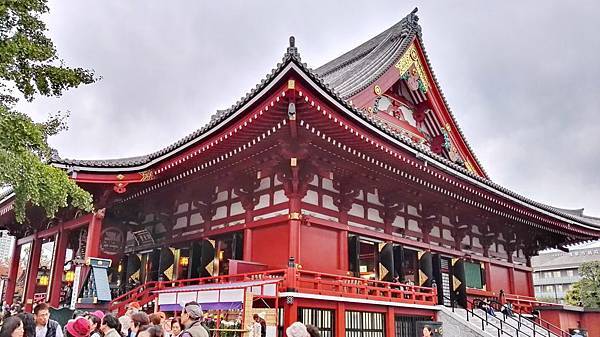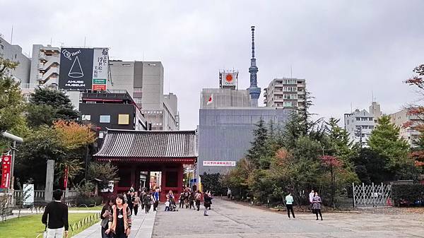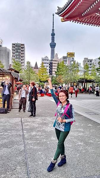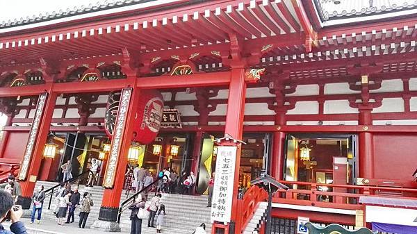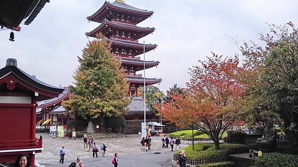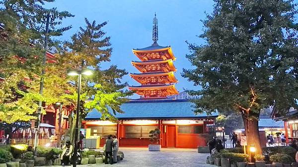 日本的寺院建築如出一轍,都是朱紅色宮殿建築搭配金漆,色彩鮮明亮眼。淺草寺是目前東京都保存的最完整的古蹟之一,也是遊客最多的地方。我們走入本堂参拜後再慢慢逛到寺外,五重塔矗立在淺草寺右前方。五重塔建於1648年,被燒毁後再重建於1973年,塔高48公尺,造型雄偉美觀。