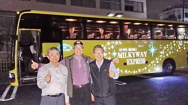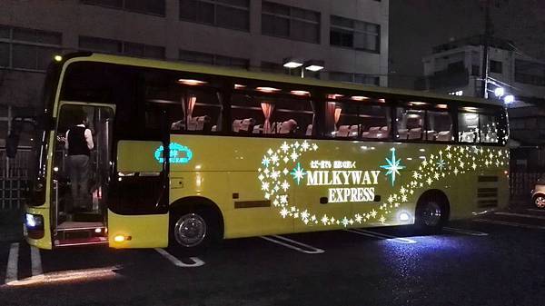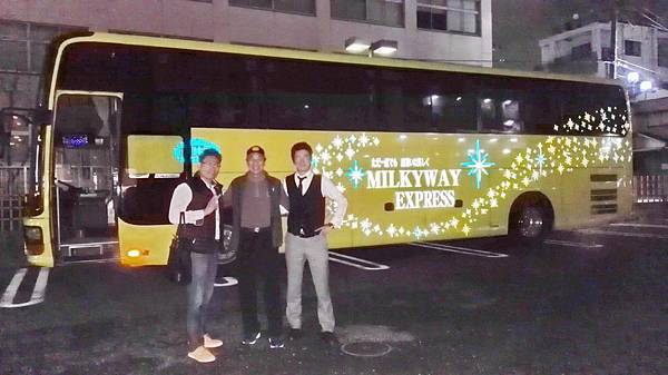 離開淺草觀音寺後是晚餐時間,今晚是壽喜燒吃到飽。晚餐後發現我們的遊覽車有特別之處,車身的銀河圖案竟然會反光,據司機先生說,他是花了台幣25萬以特殊顏料制作而成,果然與眾不同。