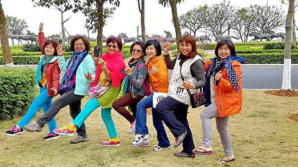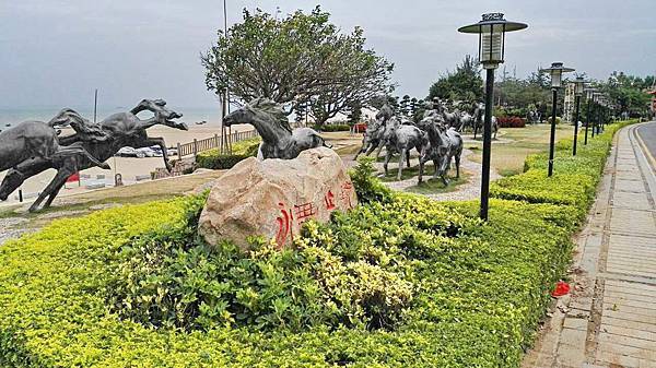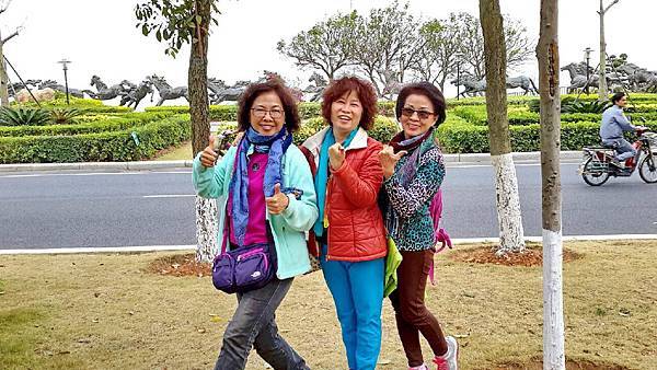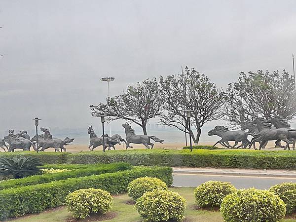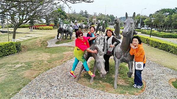 在茶博士耗了半天時間,出來後感覺戶外空氣舒服多了。午餐的時間是愉悅放鬆的,大夥兒紛紛在周圍拍拍照,尤其是餐廳對面有一群馬的雕像。數十隻奔馳如飛的駿馬,壯美的姿態栩栩如生,四蹄翻騰、長鬃飛揚、仰天長嘯、一隻接一隻,似乎馳騁在草原上,真是一幅奔騰和力量的美交織而成的美麗裝置。