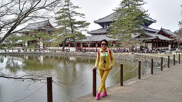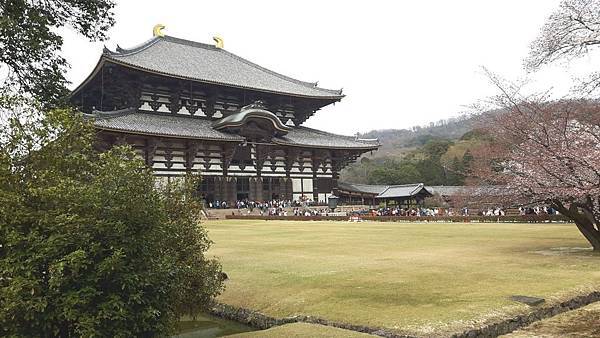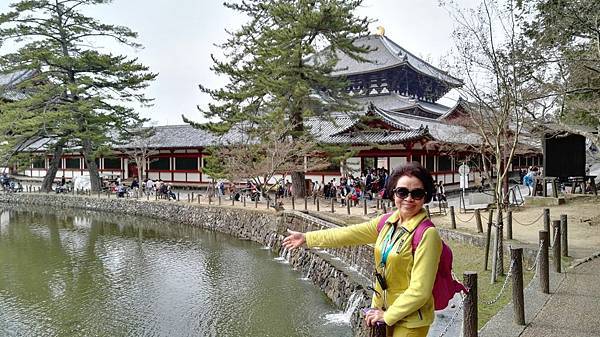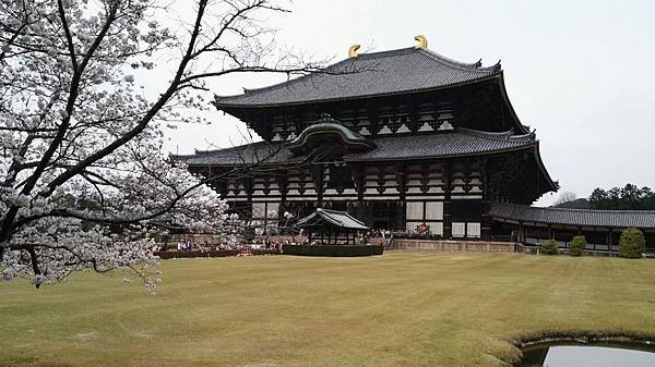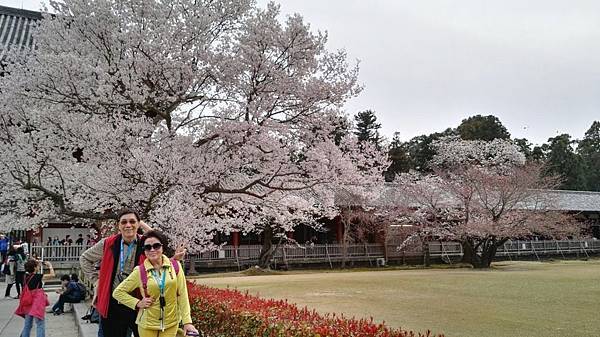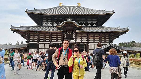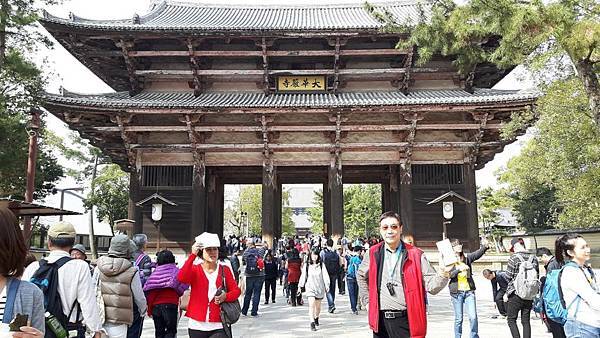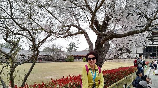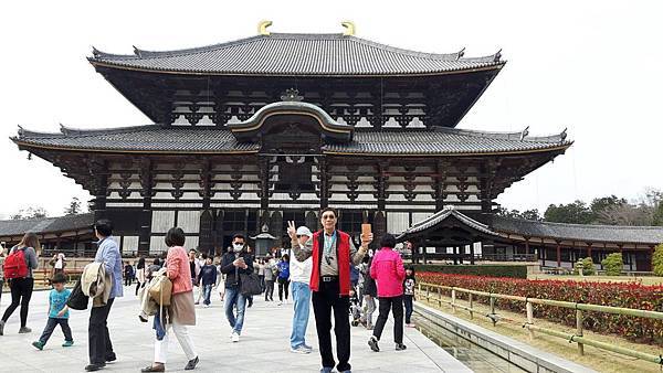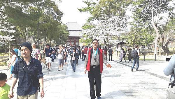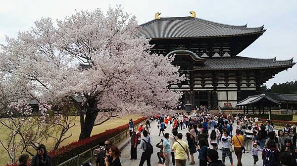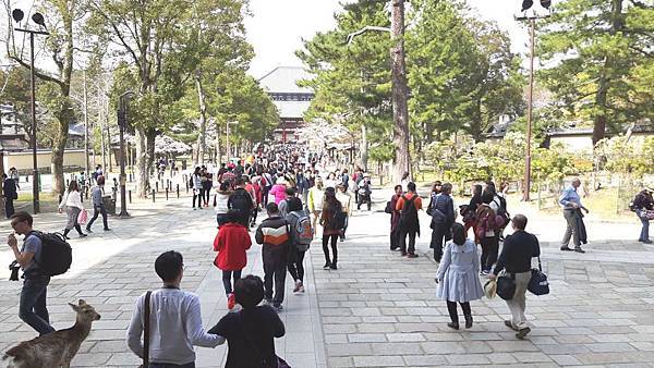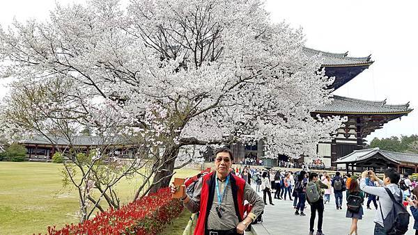 在這片廣大的公園內還分佈了多座歷史文物和世界文化遺產如東大寺和春日大社,奈良大佛等,我們安排參觀東大寺。走進奈食公園西側,穿過木造的大華嚴寺牌樓,遠遠地便見一座宏偉的黑色木造建築聳立在正前方,周邊不但有綠意盎然的庭園圍繞著,參道兩側滿開的櫻花把東大寺襯托得更為莊嚴肅穆。
