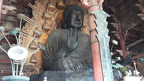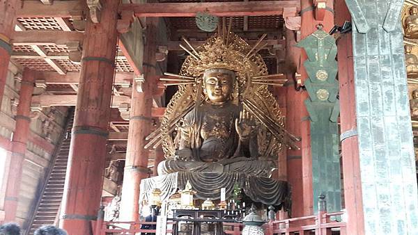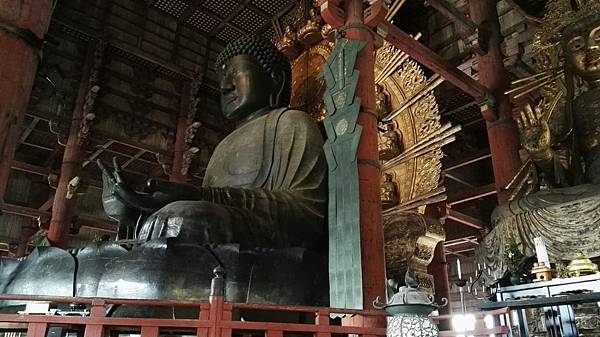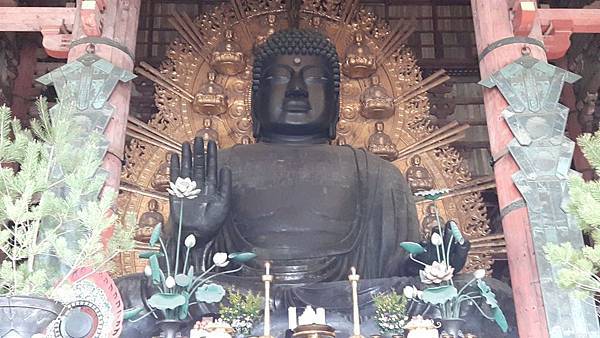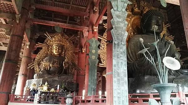 東大寺的佛殿內供奉了三座大佛,中間之青銅奈良大佛坐像高15米,蓮花座外圍70米,大佛兩旁分別是木雕的觀音和菩薩坐像。靜觀奈良大佛,感覺到佛相流露出的威儀莊嚴神韻,讚嘆崇敬之心不禁油然而生。這幾尊大佛最早建於8世紀,曾二度毀於戰火,後來再重建至今,已有300多年,也算是歷史悠久的古佛了。而東大寺的建築、雕刻和藝術文物在日本文化史上亦佔有極重要的地位。大佛殿木造結構氣宇非凡、氣勢雄偉,正面寬57公尺、深50公尺、高48公尺,是世界最大的木造建築。