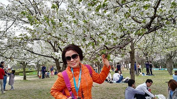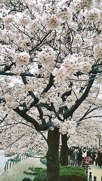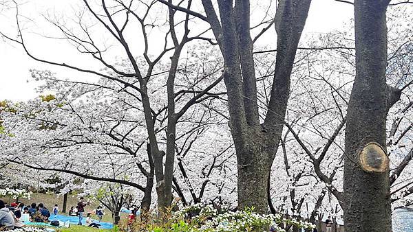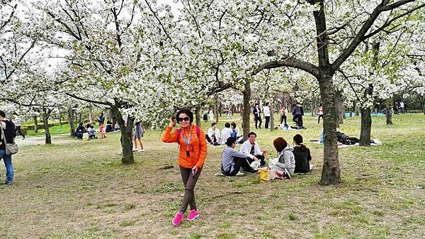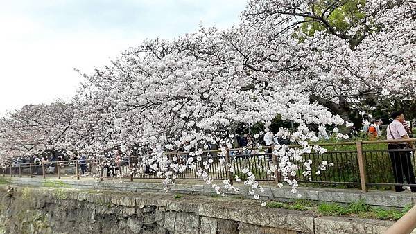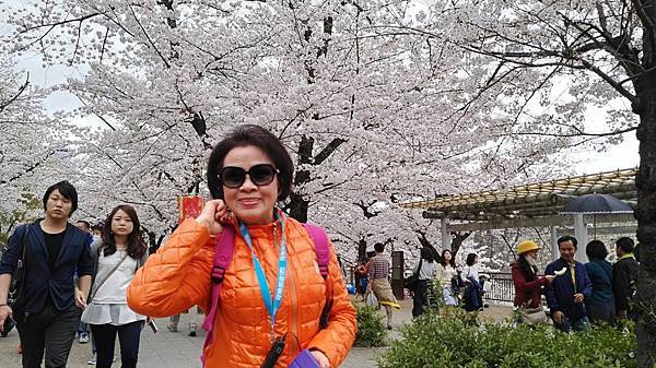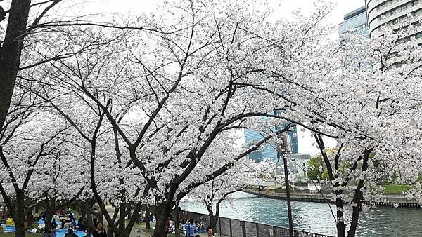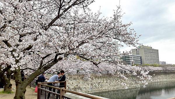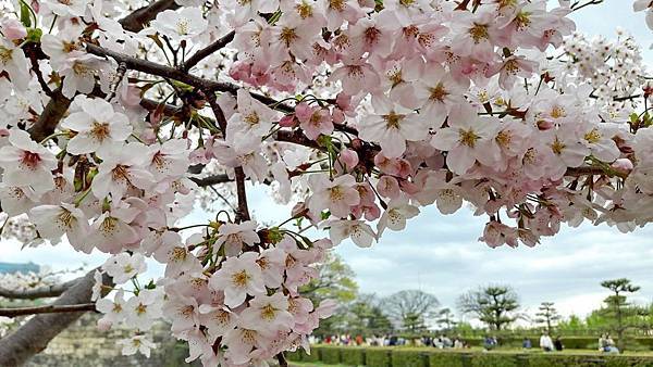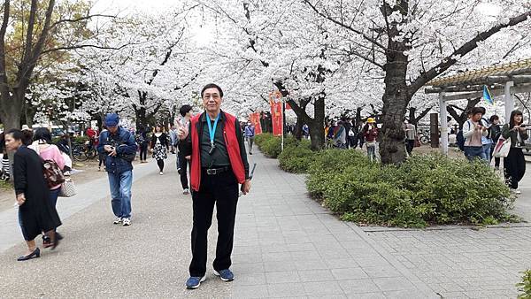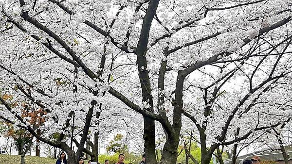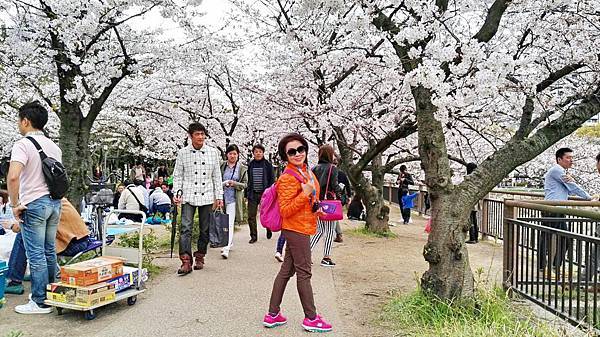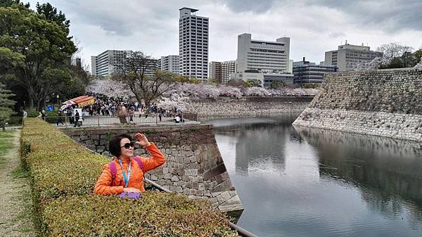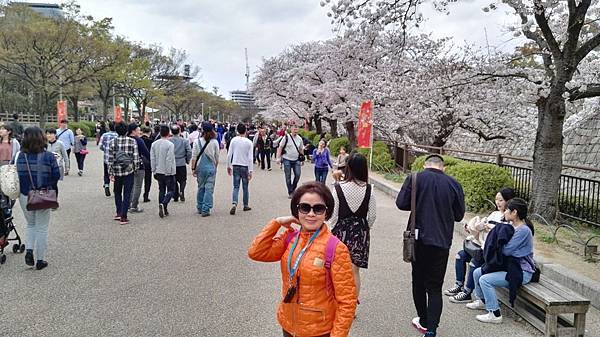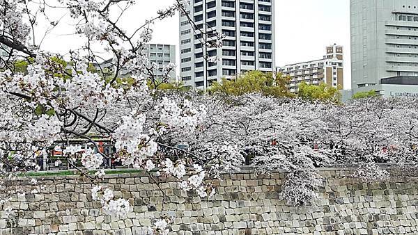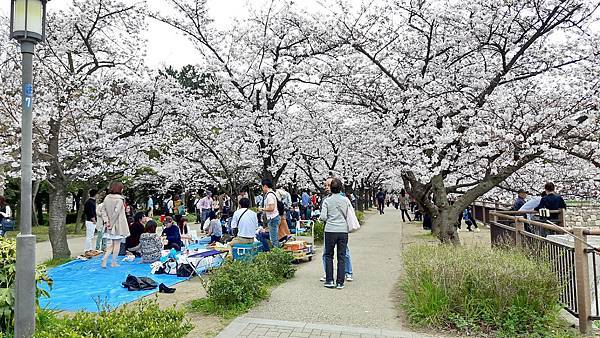 大阪城公園的櫻花樹大部份是以「染井吉野櫻」為主,其他品種也有但並不多。這裡的櫻花樹都有將近百年的樹齡,枝幹蒼鬱,花繁茂盛。染井吉野櫻在含苞待放時是醉人的玫瑰紅色,開花是粉紅色,全開後就變白色了。今年來賞櫻正逢花開時,置身粉紅色花海中,綿延無際的櫻花林,一片絢爛朦朧的粉色世界,充滿詩情畫意。在日本,春季第一大盛事就是賞櫻,賞櫻是日本傳承數百年的一種風雅習俗,日本人愛櫻花更愛賞櫻花,因此在盛開的櫻花樹下,常見男女老少呼朋引伴喝酒唱歌,形成了一種日本特有的賞櫻文化。