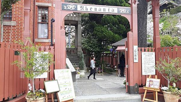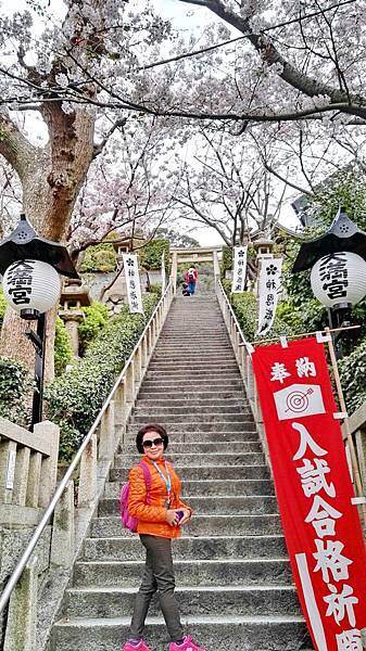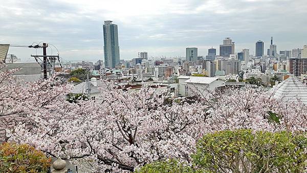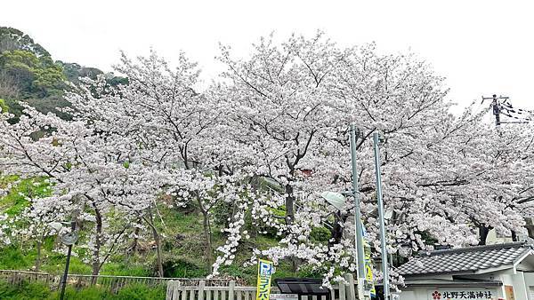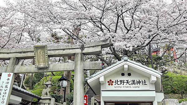 風向雞館的左側是神戶的天滿神社。其實日本到處都有天滿宮,它主要祀奉學問之神「管原道真」,是學生考試之前最愛祭拜的神。爬上石階,兩旁的吉野櫻花開燦爛,小小的神社位在山坡上,周邊圍牆上全是滿開的染井吉野櫻,居高臨下,整個北野地區一覽無遺。
