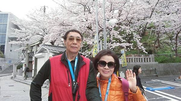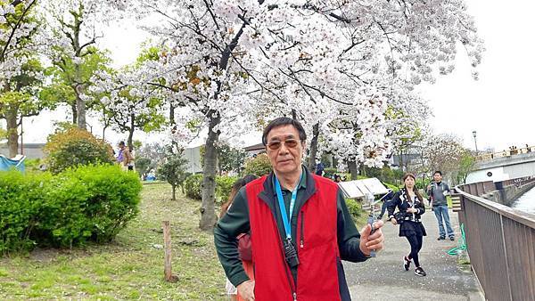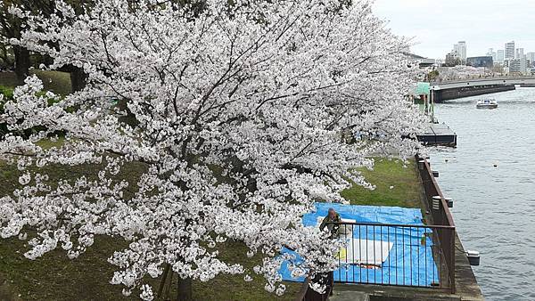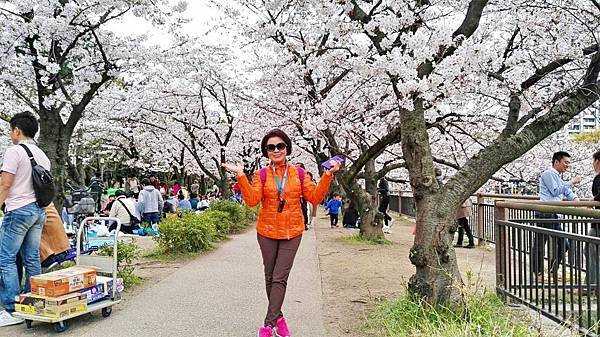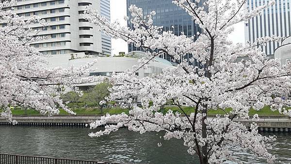 9:50分離開北野前往大阪,車程大約45分鐘,我們要到大阪綻屋橋碼頭搭船,搭乘水上巴士(Aqualiner)遊綻川(大川)賞櫻,結果碰到大塞車,眼看我們11點的船班時間將到,領隊只好帶我們安步當車趕到搭船碼頭,路上有大片櫻花海但無暇佇足觀賞,只能邊走邊頻頻回頭觀望。