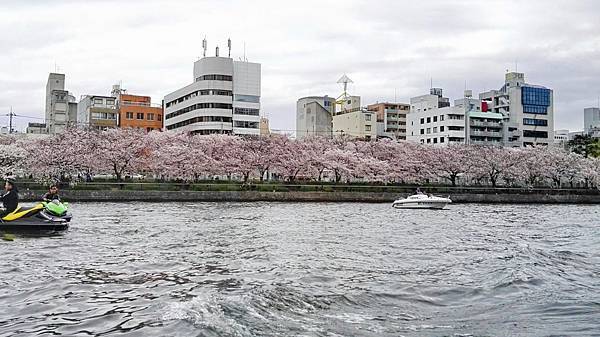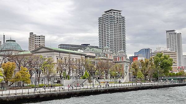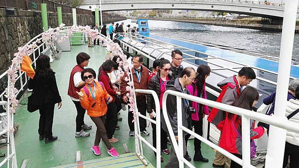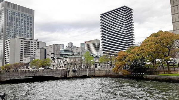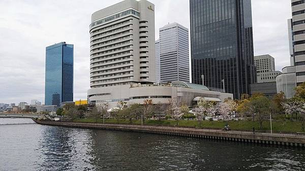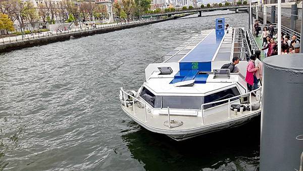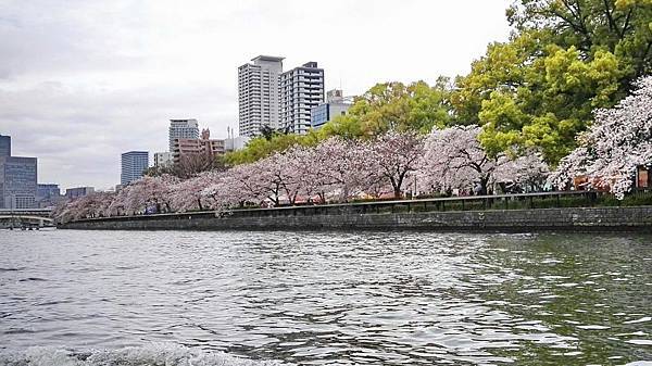 水上巴士是一艘造型新穎,扁平型的玻璃船,漂亮的外觀,舒適的船艙,坐在裡面往外看去,可從180度玻璃窗盡情享受河岸風光。滔滔的河水、滾滾的浪花不停地拍打著,30分鐘的遊船時間內,我們周遊大阪城和商業中心的中之島景色,再從河川眺望大阪的街道風景、現代化的辦公大樓、巴洛克式建築的中央公會堂以及河岸邊綠地公園櫻花樹成排、紅粉燦爛的盛況,美不勝收。