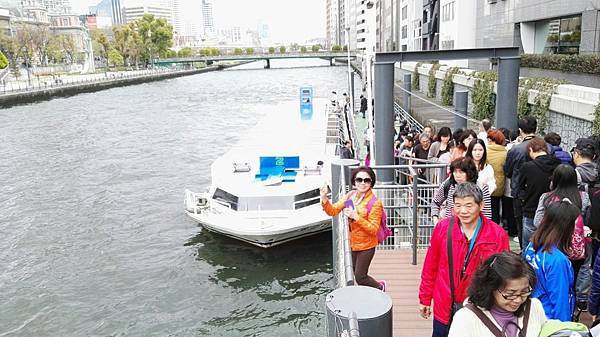 在大阪市區內河渠交錯,所以水上的交通也很普遍,尤其是在觀光方面就有很好的發展。市內最大的河川~淀川,領隊說它也稱為「大川」,有著寬闊的水道,水上巴士定時定點航行其上。