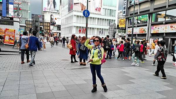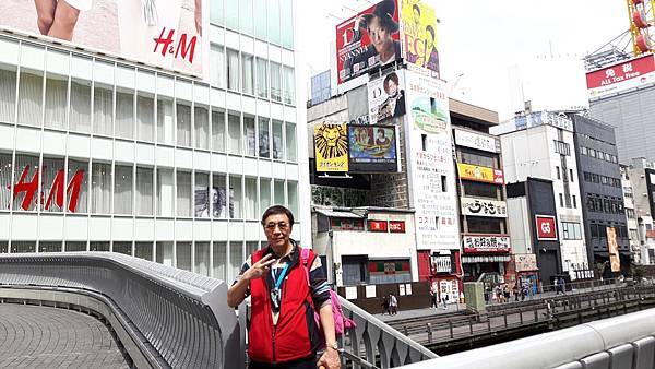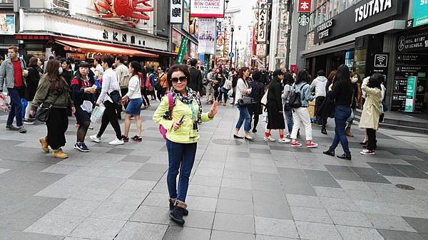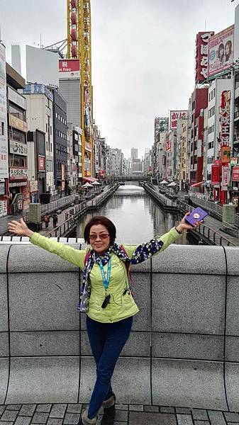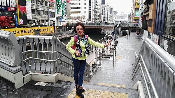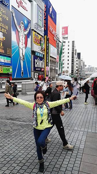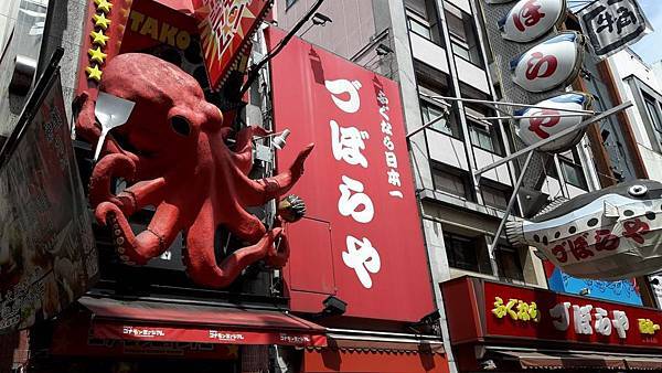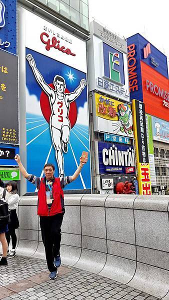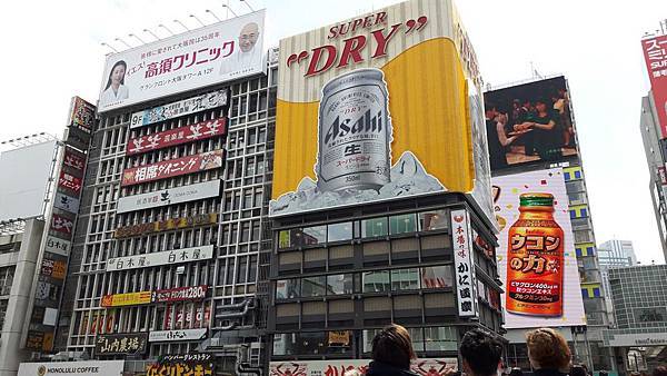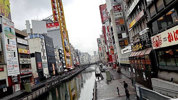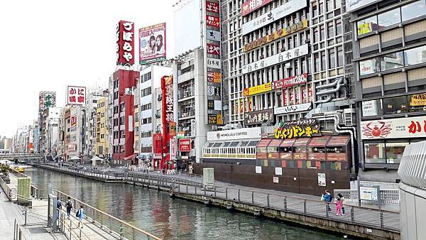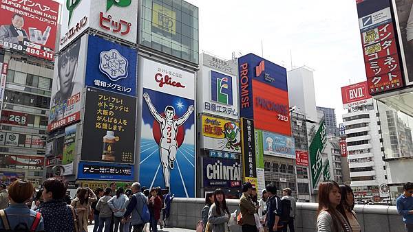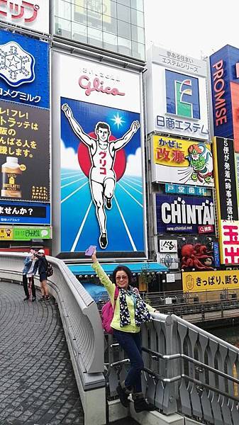 我們停留在道頓堀川的河堤邊看來來往往的人群川流不息,河堤兩旁密集的店家和熱絡氣氛成為心齋橋筋、道頓堀筋和戎橋筋購物街最驚人的風景和生命力組合,尤其是河岸邊一個巨大的glico彩色廣告看板,它是購物街最具代表性的景致,遊客到此一遊無不在此拍照留影,還要模仿跑跑男的姿勢,入境隨俗,我們也來拍一張。glico其實是大阪一家老字號甜品公司,這個廣告看板自1935年就有了,歷經數十年,現已是第六代更新,只要看到這看板,有經驗的人都知道你來過心齋橋了。除了glico以外,斗大的活動螃蟹招牌也是這裡的地標,其他各種大型廣告看板和霓虹招牌多得難以數計,到了夜晚霓虹燈光閃爍,肯定讓人眼花撩亂。