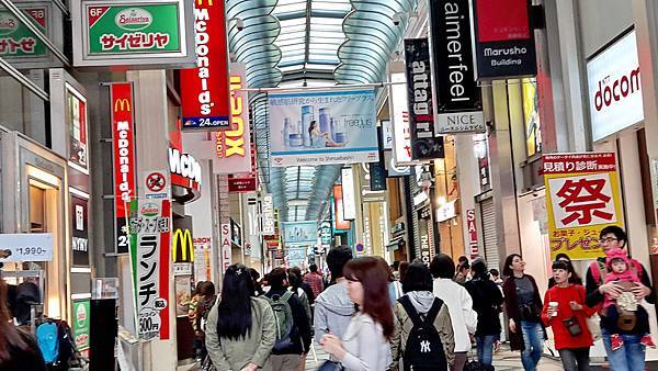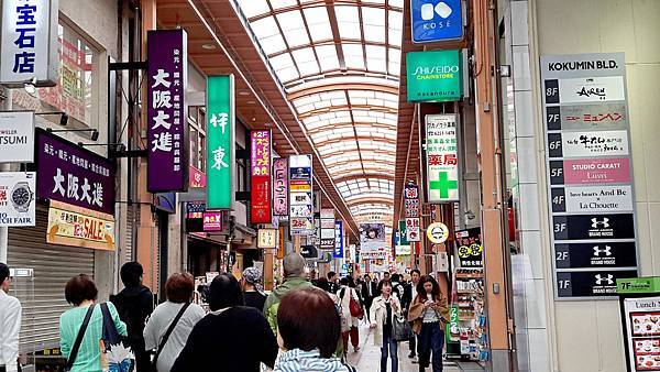 來到心齋橋真是大開眼界,這裡商店似乎比人多,拱型有天棚的商店街是大阪的特色,走在棚下不怕太陽曬,更不會被雨淋,日本人就是那麼善解人意。長達數百公尺的商店街幾乎看不到盡頭,宛如時光隧道,商店櫛比鱗次,各有其特色,逛了左邊逛右邊,每條街都一直延伸,真不愧是大阪最知名的購物區,熱鬧非凡。