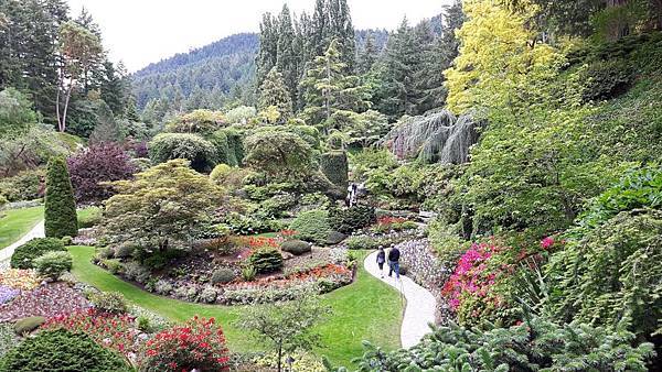餐廳前方是露天廣場,廣場中央有一隻佛勞倫斯青銅山豬,據說摸了豬鼻子會帶來好運呢,難怪被遊客摸得發亮的豬鼻子在陽光下閃閃發光。從廣場向左邊轉入,經過一條林中小徑後,轉個彎,前方忽然豁然開朗,有柳岸花明又一村的感覺,原來這裡就是布查德花園最經典的下沉花園(Sunken Garden),這裡也就是最早的石灰石現場。位在地平面約30公尺下方,那兒真是一個色彩斑斕、七彩繽紛的美麗世界,在數不盡的花床上,開滿了各式各樣千嬌百媚的花朵,五顏六色、爭妍鬥豔、奼紫嫣紅、彩蝶紛飛,簡直美得難以形容。