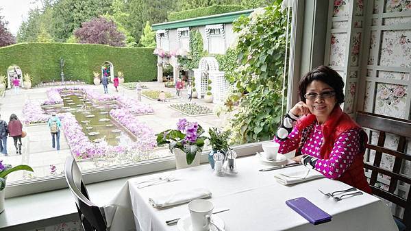 踏入布查德花園的同時,我很敏銳地嗅到了百花的香氣,入口處一隻小蜂鳥在花叢中吸食花蜜引起遊客一陣拍照的騷動。參觀花園前,我們行經水車廣場、遊客中心、布查德故居和咖啡店後在園中的飯廳餐廳(The Dining Room Restaurant)安排了有機花餐,傳說這家餐廳不但天天客滿,一位難求,價格還不便宜呢。讓我疑惑的是,即是〝花餐〞,卻從頭到尾沒看到或嚐到有〝花〞出現在餐食中,連茶也是一般的茶,本來還很期待最後能來一壺玫瑰花茶咧!不過其用餐環境極好,透過玻璃窗就可以欣賞到花團錦簇的義大利花園,餐點也很美味,該滿足了。午餐後就是最愉悅的賞花時間了。