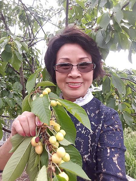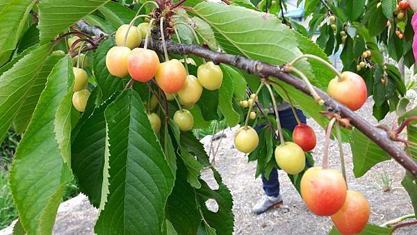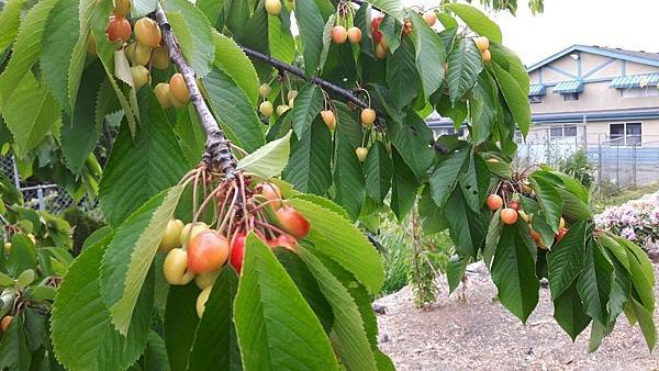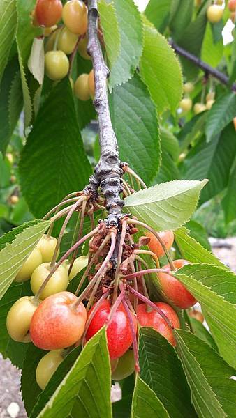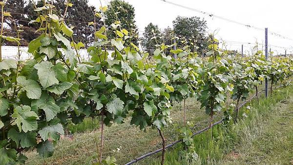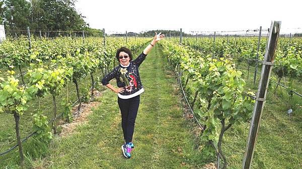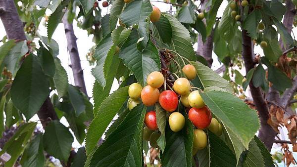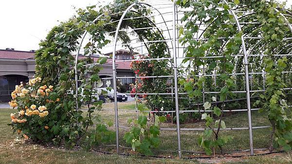 大夥兒試喝冰酒後也紛紛下單購買、除了冰酒還有楓糖漿等,我溜出酒莊到外面來賞花。酒莊的規模不小,旁邊還有大片葡萄園,大門前面種了整排玫瑰花開得燦爛奪目,後來又發現酒莊後面有白櫻桃樹,結了果實但尚未完全成熟,超可愛的,意外的發現竟也讓大夥兒開心玩了好久。