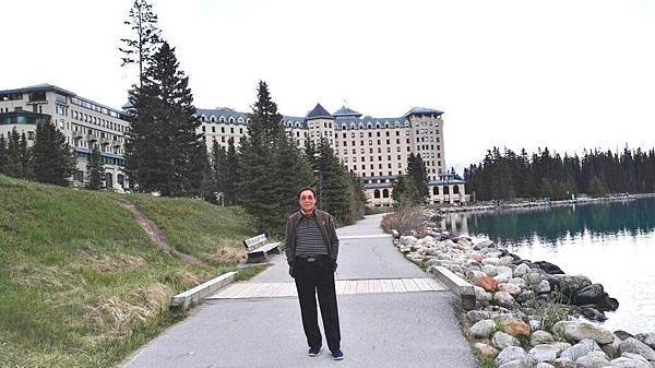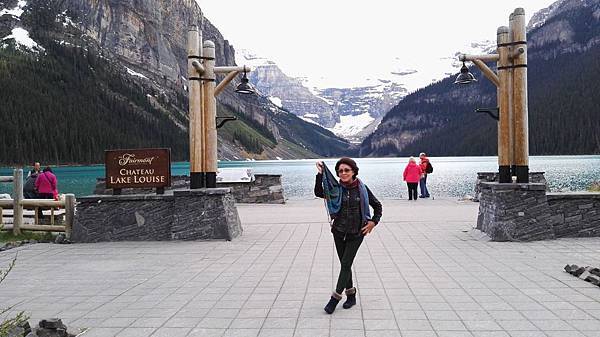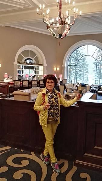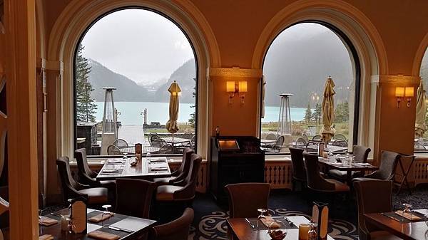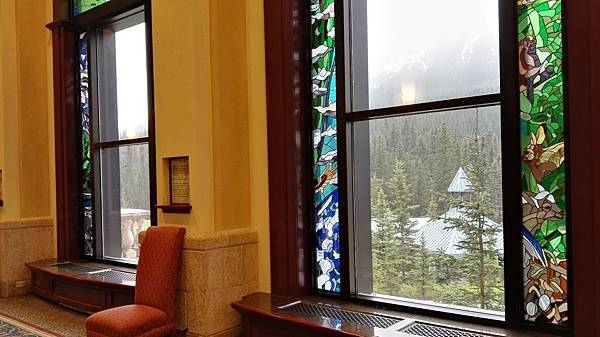 城堡飯店另一項為人所津津樂道的是在一樓面湖的咖啡廳內,從一扇供型玻璃窗戶望出去,框格中的美景正是湖光山色的露意絲湖,這一扇窗也稱為「世界之窗」,領隊說窗框中的美景價值百萬,所以稱之為百萬之窗也不為過。要找機會坐在這百萬窗前的咖啡座喝杯咖啡不容易啊!多少人排隊等著呢。拱形窗旁還有一排四方形玻璃窗,每個窗戶都是一幅不同畫面的風景,好像一個個照相機的大型鏡頭,把室外的露意絲湖、維多利亞山巒、冰河和湖邊的蒼松翠綠一一被嵌入鏡頭中,那唯美的畫面無需多描述,而今天雨中的風景卻也是另一種境界。