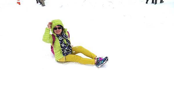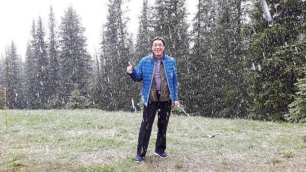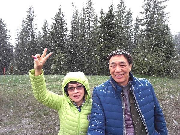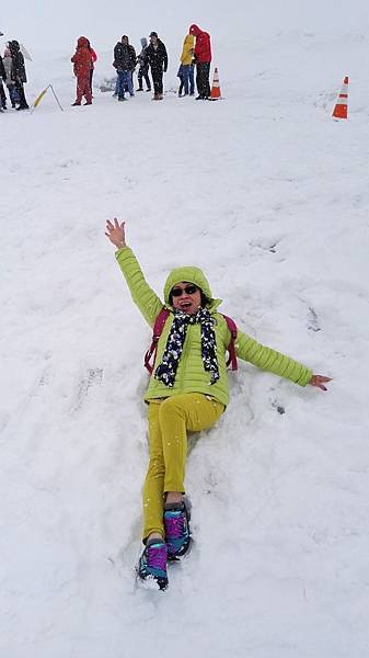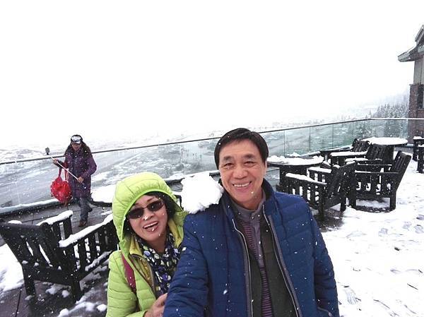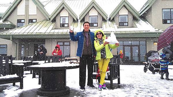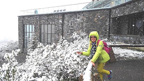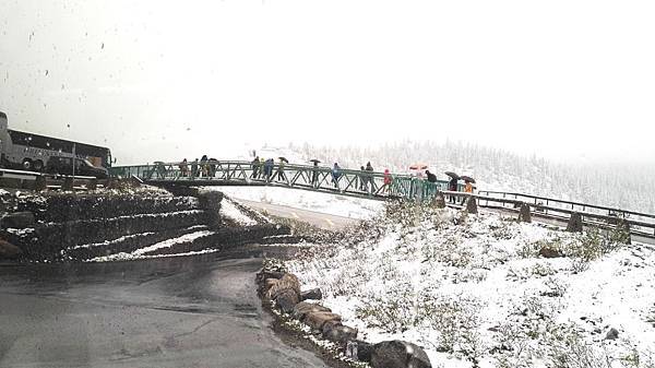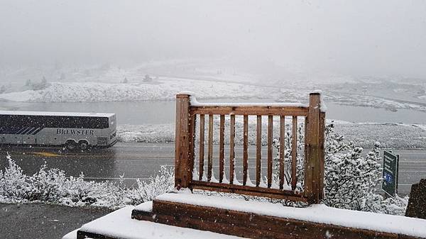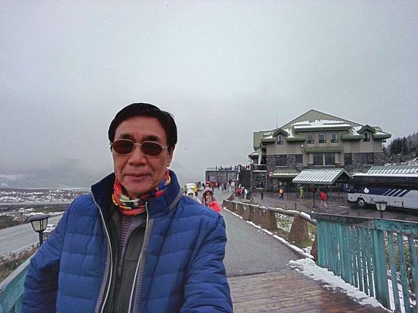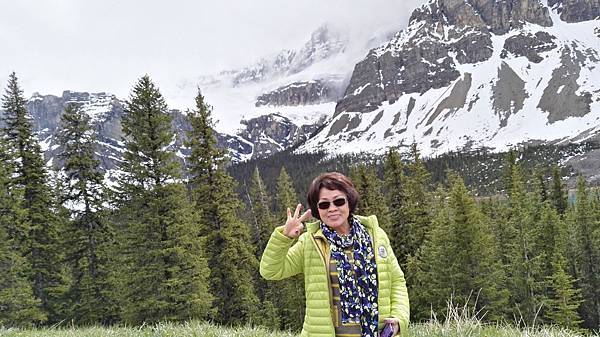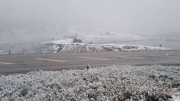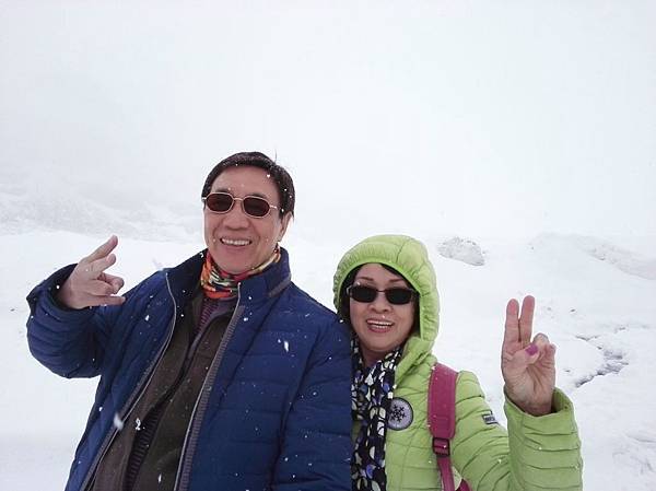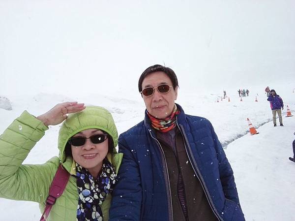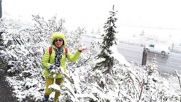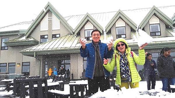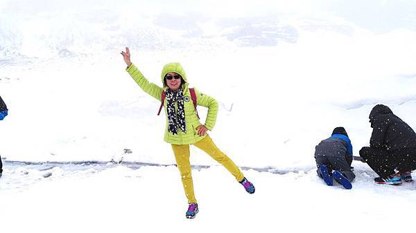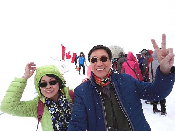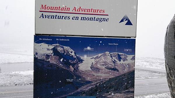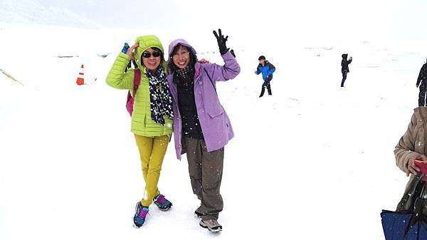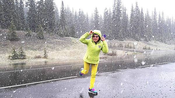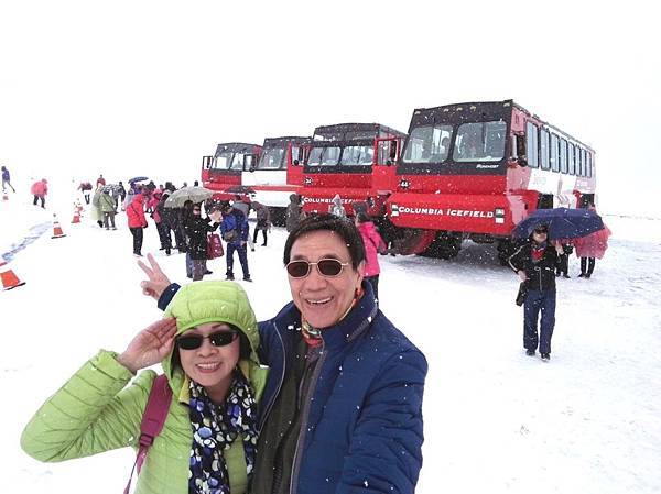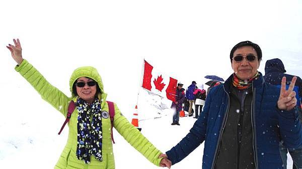 冰原大道海拔大約在1,550公尺,雨仍然持續著,我專注地看著車窗外綿延的道格拉斯冷杉!忽然車內有人驚呼:「下雪了!」真的是下雪了!雪花像鵝毛!像棉絮一樣飄落在車窗上,有幾位朋友第一次看到下雪簡直樂歪了呢!James特地停車讓我們下車體驗一下被雪花灑滿身上的fu。雪越下越大,車窗外已成了一片銀白色世界,本來要先參觀佩多湖和鴨爪冰河,可是佩多湖因下雪封路,鴨爪冰河上一片白茫茫也看不清楚,只好先上哥倫比亞冰原,至於下午能否看到這兩個景點就只能憑運氣了。在大雪紛飛中,車子經過了右手邊的壯觀山壁「哭牆」(Weeping Wall) 和軍艦岩後,不久即抵達了傑士伯國家公園的哥倫比亞大冰原遊客中心。