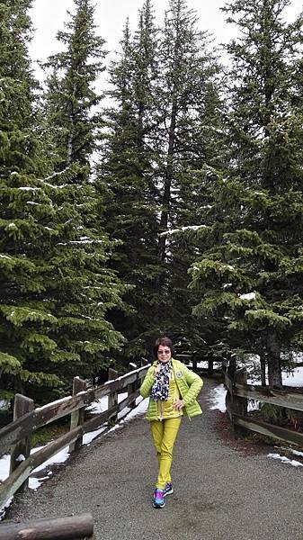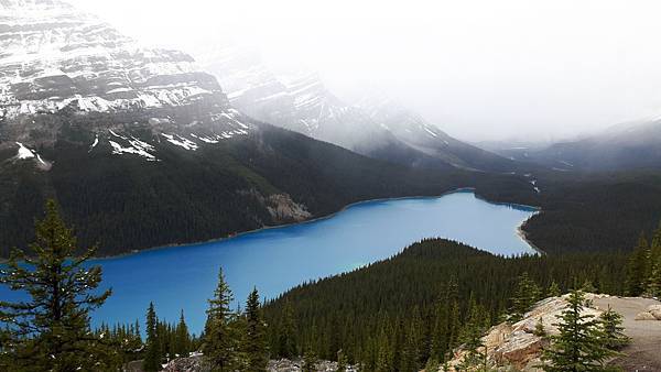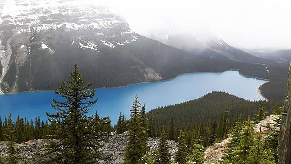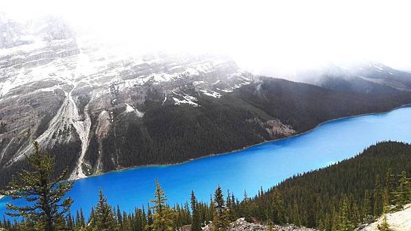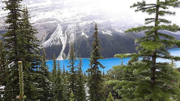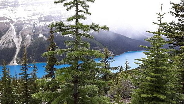雪過天晴後,佩多湖(Peyto Lake)終於開放參觀,從停車場穿越一小段冷杉林小徑到觀景平台,居高臨下俯視佩多湖全景是最美的,我對那片碧藍色的湖景畫面至今仍然印象深刻。