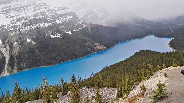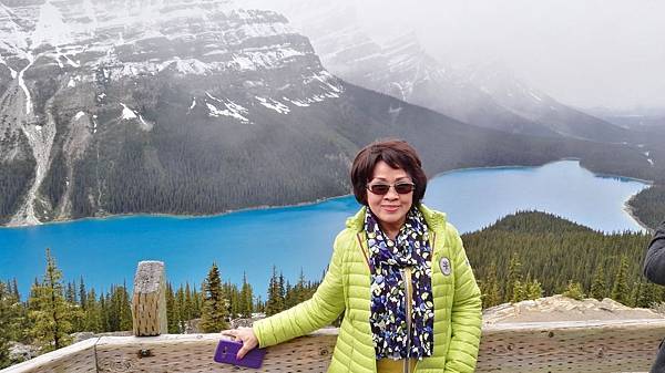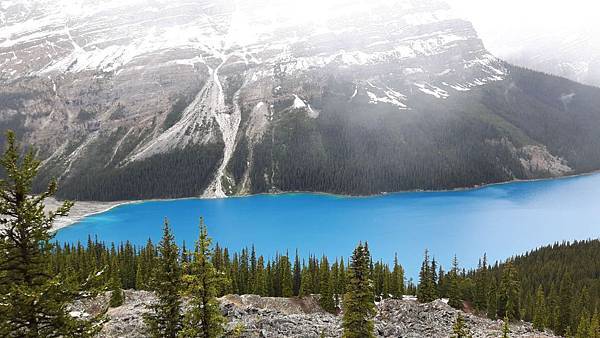 佩多湖是班夫國家公園中排名第5的美麗湖泊,整個湖由冰川融化而成,湖水顏色因天氣和季節而產生微妙的變化,時而湛藍、時而碧綠、時而乳白或土耳其藍,神祕感十足。領隊說我們是一群超有福氣的人,她來佩多湖無數次,就數今天的碧藍色湖水最美,美得不可思議。