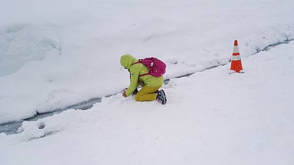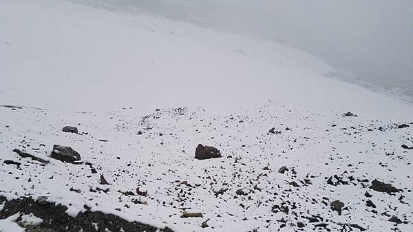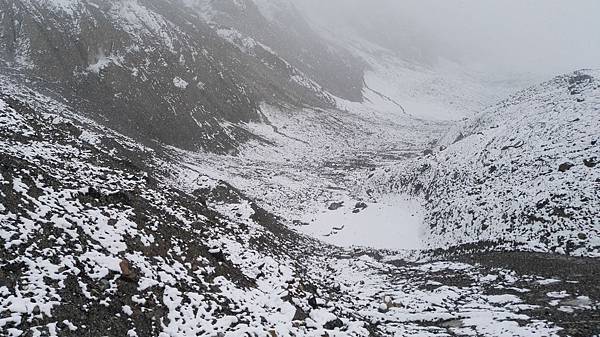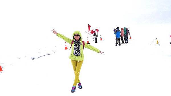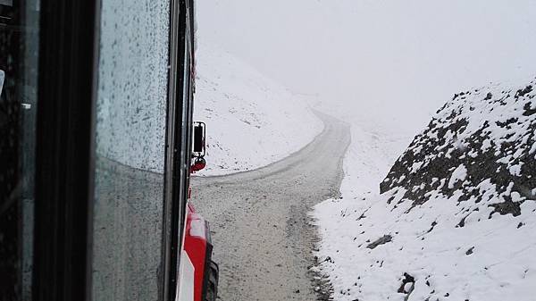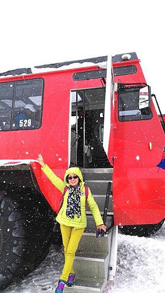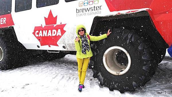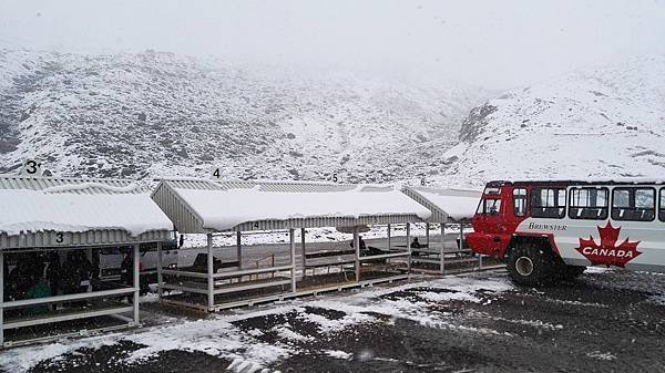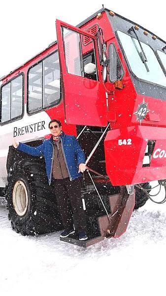 到了遊客中心,這裡雪下更大了,在二樓自助餐廳解決了午餐後,搭乘景區Brewster 接駁巴士從冰原中心出發,一路蜿蜒上行,穿越冷杉林後,眼前是雪白一片的冰雪天地,10分鐘左右抵達雪車基地站,接著再換乘有巨輪的冰原雪車(Snocoach) 正式進入海拔2210公尺的阿薩巴斯卡冰河。由於大雪持續下著,只覺得眼前遠近都是銀白色,雖然腳下踩踏著的正是阿薩巴斯卡冰河,但總覺得很不真實,因為根本分不清哪個是冰原,哪個是冰河了。寒風中,雪花紛飛下,腳底300多公尺深的冰河和一望無際的潔白,內心的興奮卻熱到沸點。